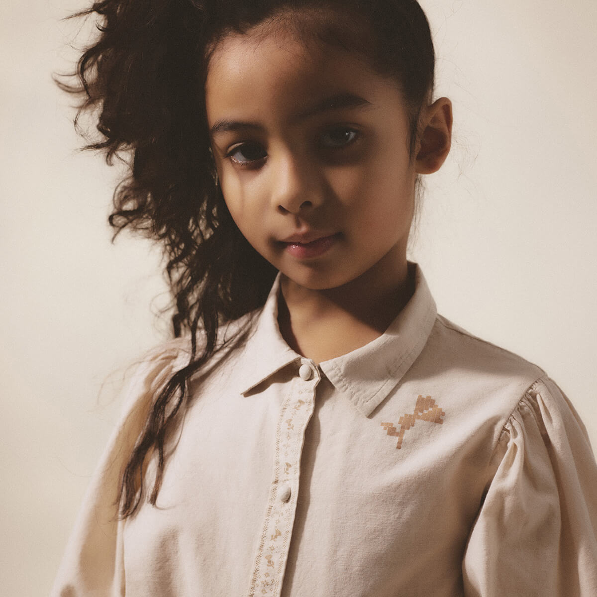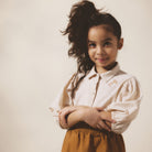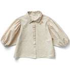 Louisa Blouse in Caffe by Soor Ploom. Puff sleeve blouse with spread collar and self covered button placket. Elastic at sleeve finish. Solid colourway with a tonal floral placket and wearers left chest.