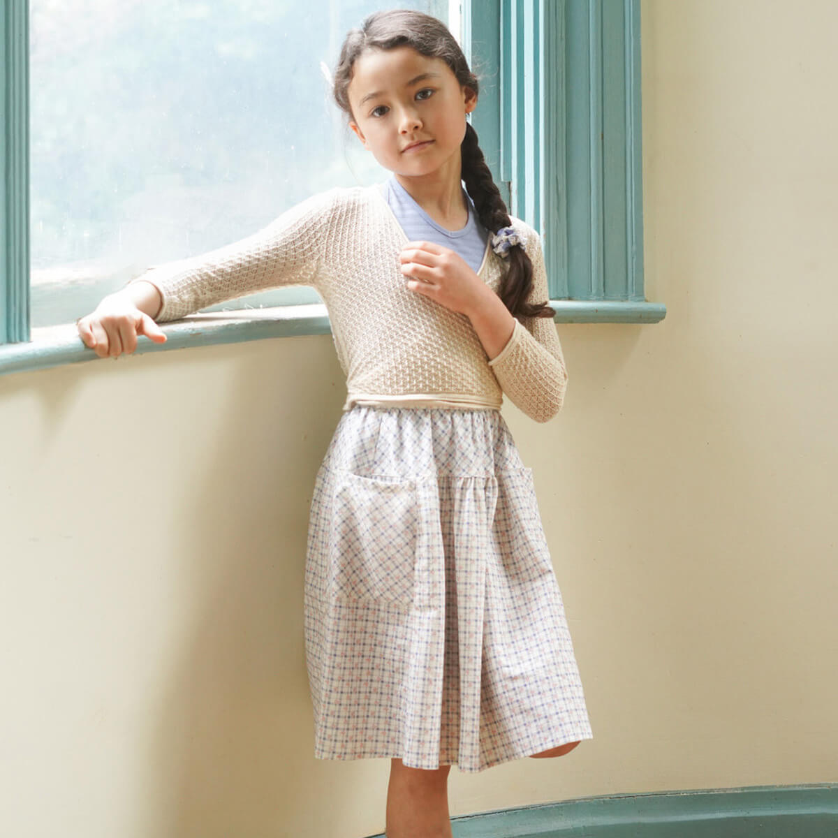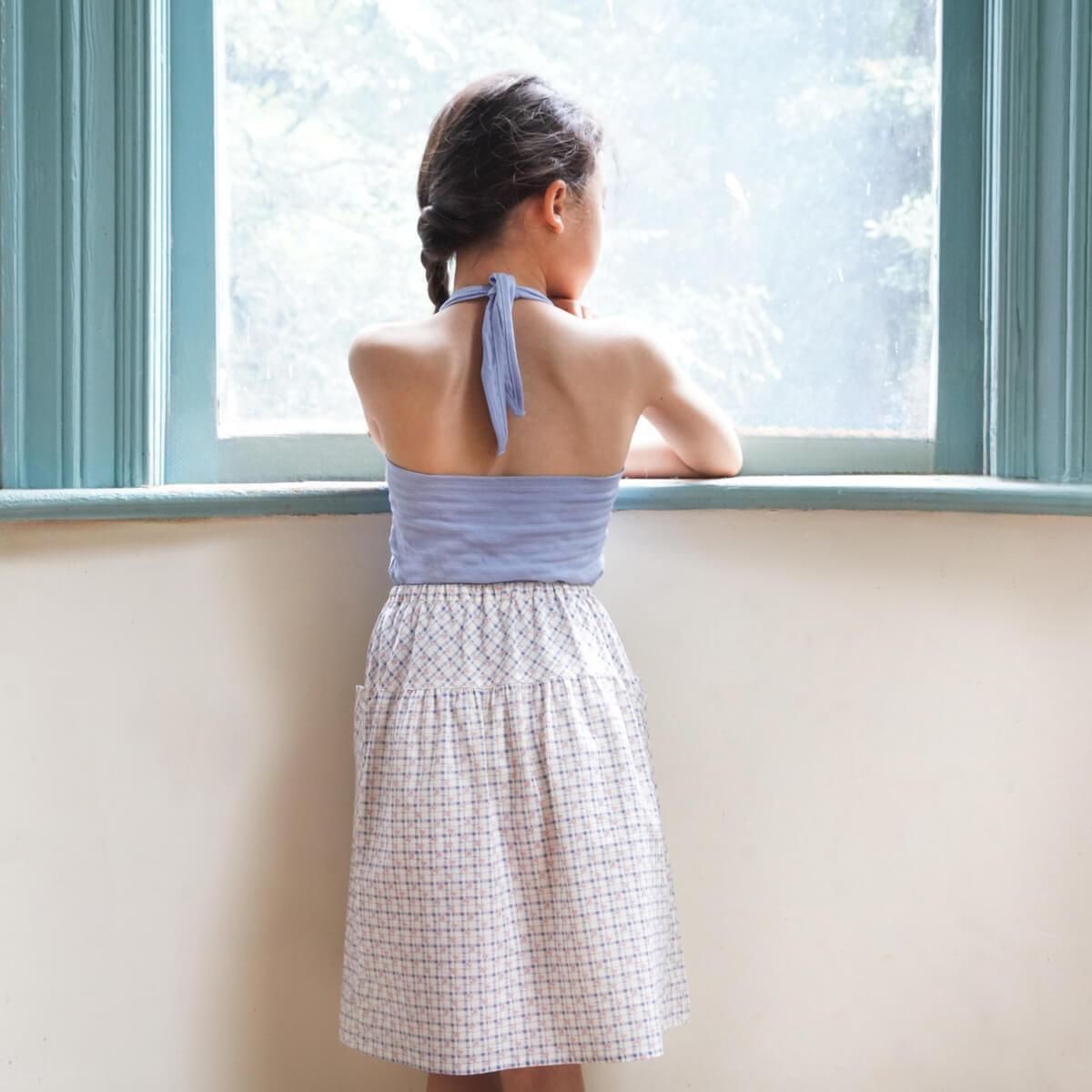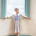 Vada skirt by Soor Ploom. Easy skirt with oversized side pockets. Elastic at back waist for ease. Falls below knee.