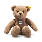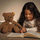 Papa Bear by Steiff. Measuring 36cm tall, this super soft Papa bear with movable limbs is part of Steiff's 120th Teddy Bear Anniversary series. The tobacco brown Papa bear is made of cuddly soft teddy fleece and comes with distinctive centre seams on his body, arms and legs. He has a laughing bear snout, a triangular, embroidered black nose and black button eyes made of plastic. Papa bear has a personal breastplate and a stainless steel "Button in Ear".