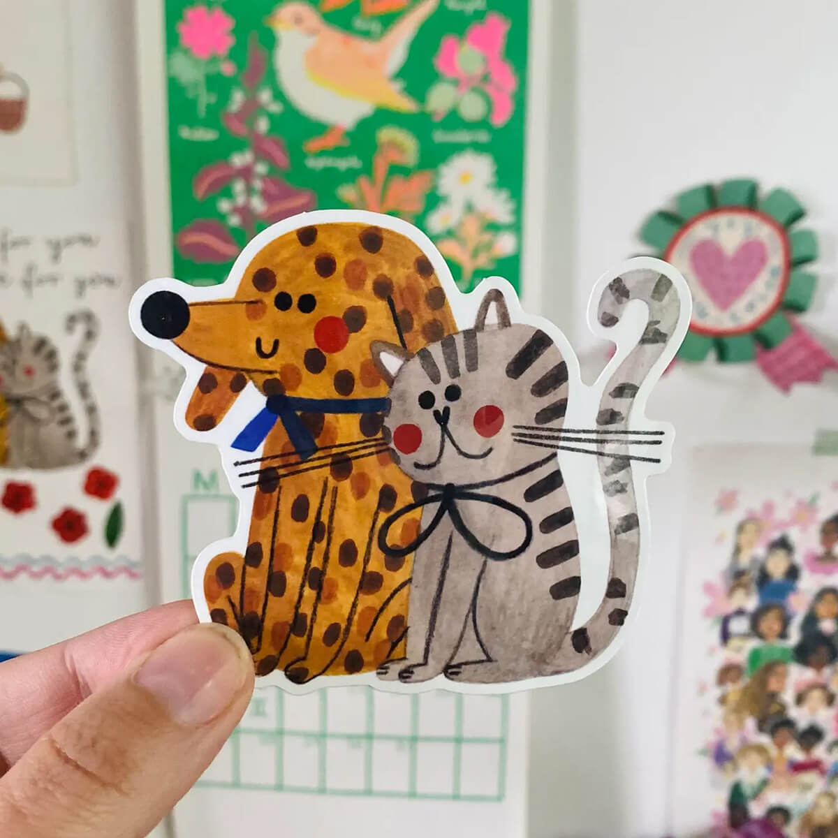 Cat And Dog Sticker by Daria Solak Illustrations. Measuring 8 cm, this sticker is a fun and quirky way to express your personality. It's a unique piece that embodies Daria's love for creating colourful designs that make everyone smile. Ideal for decorating laptops, notebooks, phone cases, and more, it's a perfect addition to any sticker collection. Enjoy the blend of humour and art in your everyday life with this distinctive sticker.