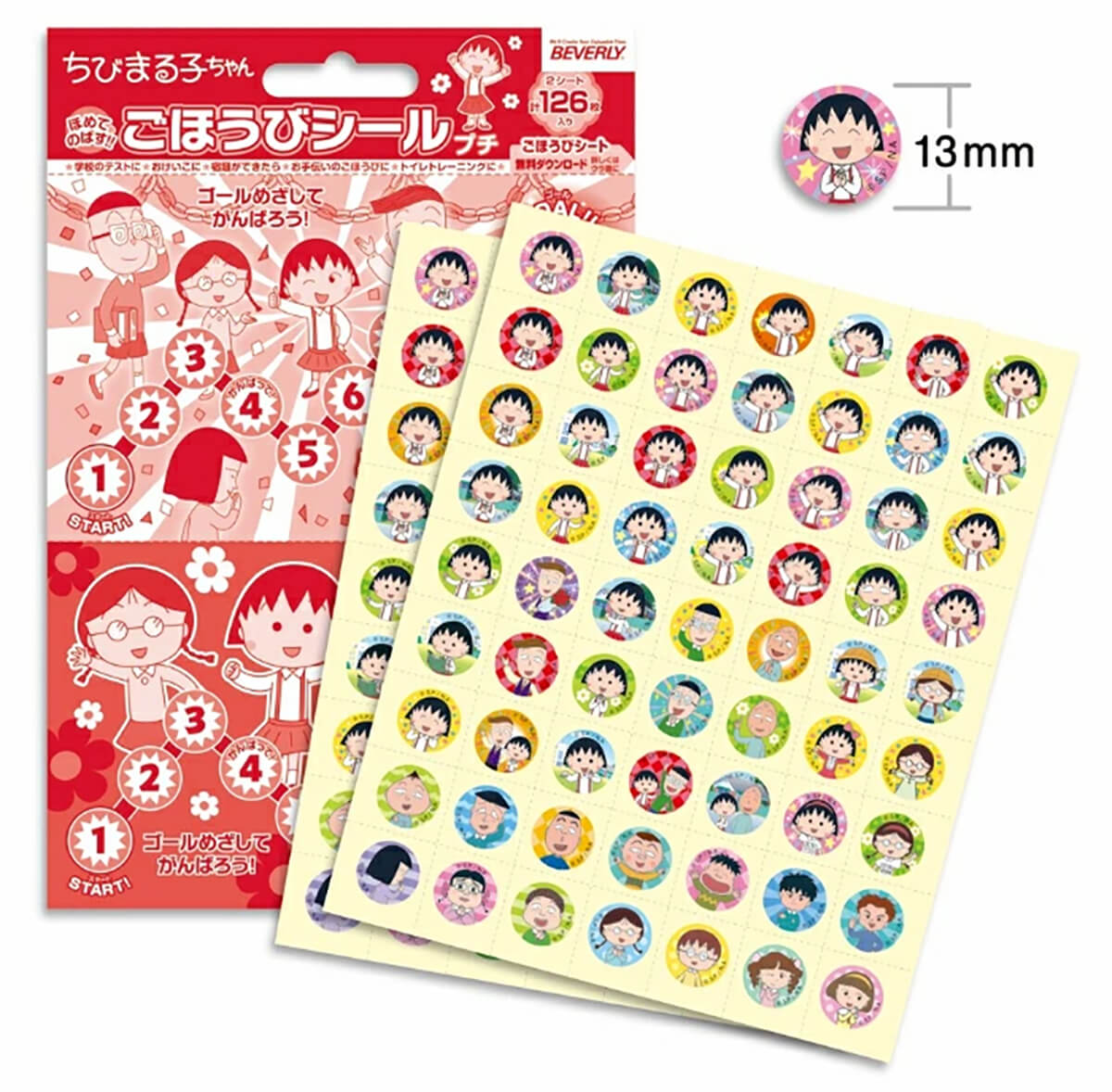 Chibimaruko-chan Mini Reward Stickers (13mm) by Beverly Japan. Praise your hard work with these cute mini reward stickers to decorate your notebooks, school books and more. Made in Japan. Each pack includes two sheets containing 63 stickers on each sheet.