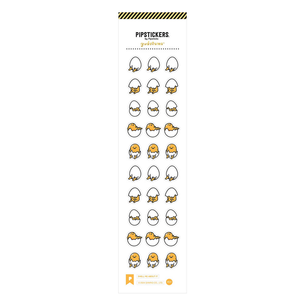 Includes one 2'' x 8'' sheet of Gudetama Shell Me About It PipStickers.