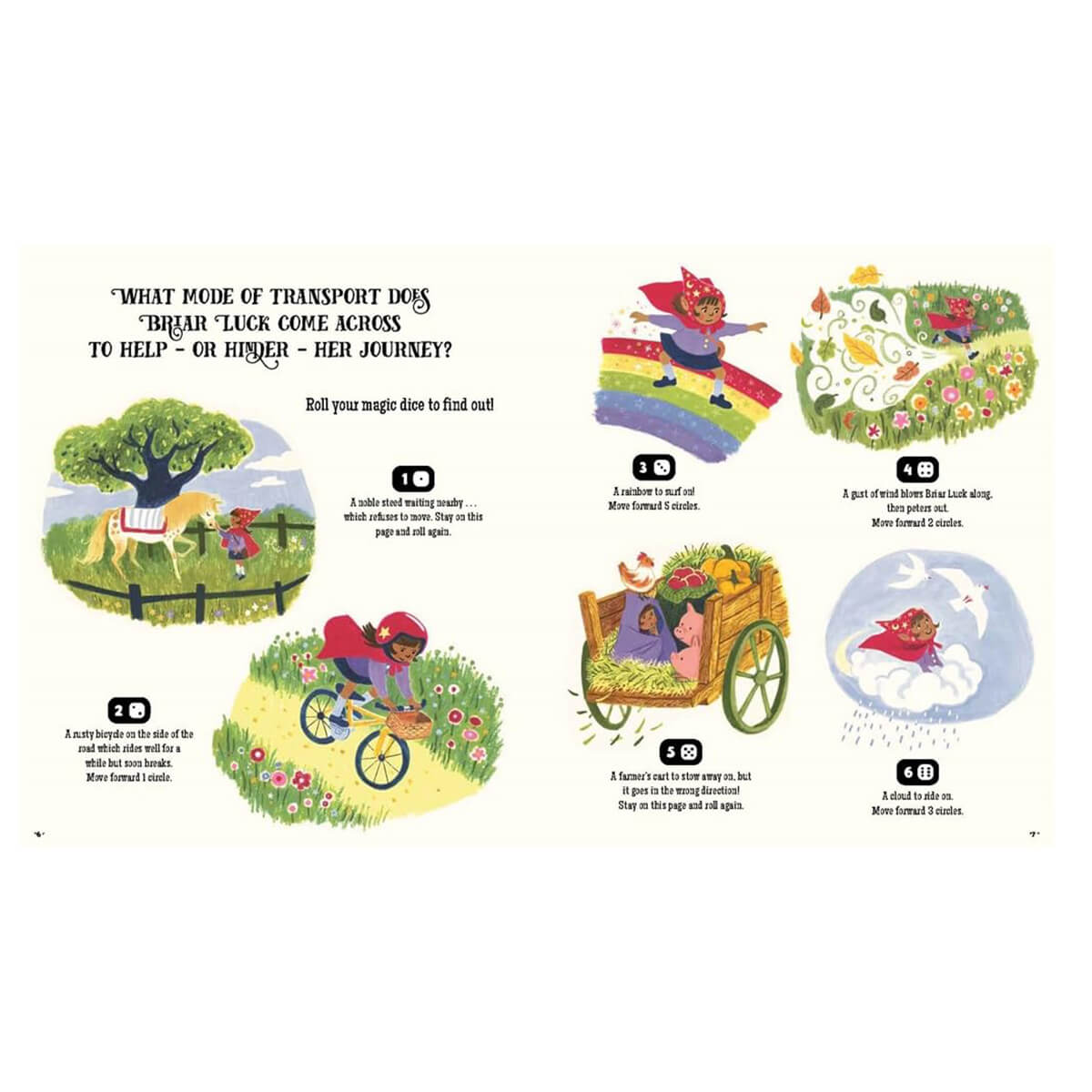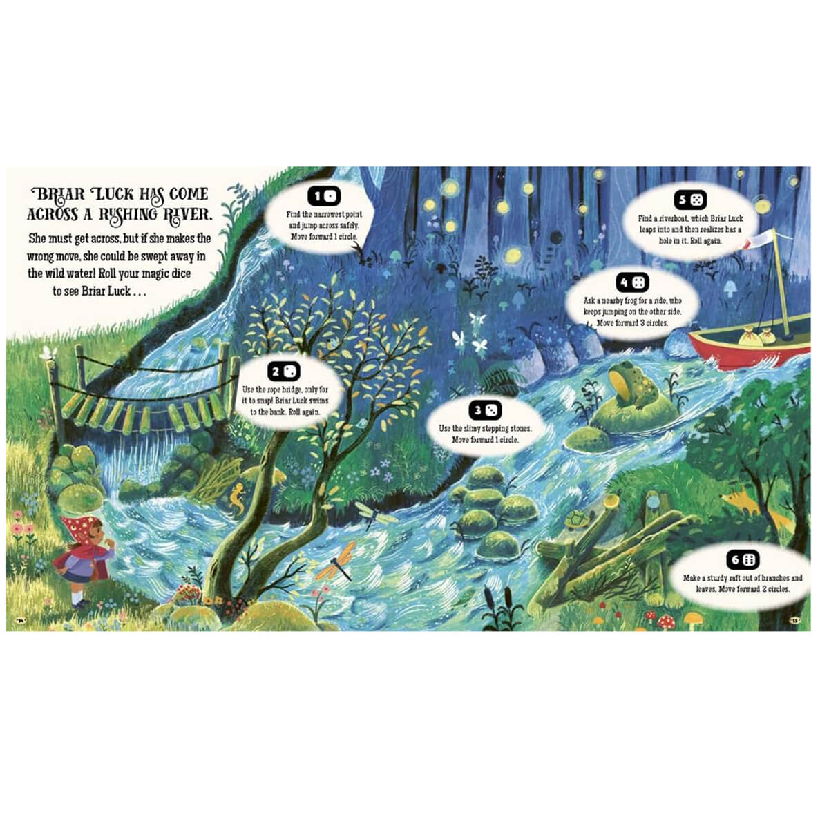 A Roll Of The Dice: Enchanted Forest by Lauren De Graaf. Roll the dice to travel through an enchanted forest in this storytelling adventure. With a fold-out map, dice and counter inside! One day, a little elf called Briar Luck begins a perilous quest... Get out your fold-out map and roll your dice to help her move through the enchanted forest and find the Jewel of Everlasting Life. Every time you hit a 'Do not pass!' square you'll go back to the book and roll your dice to help Briar Luck overcome challenges, whether that's getting over the rushing river or getting past a group of goblins.