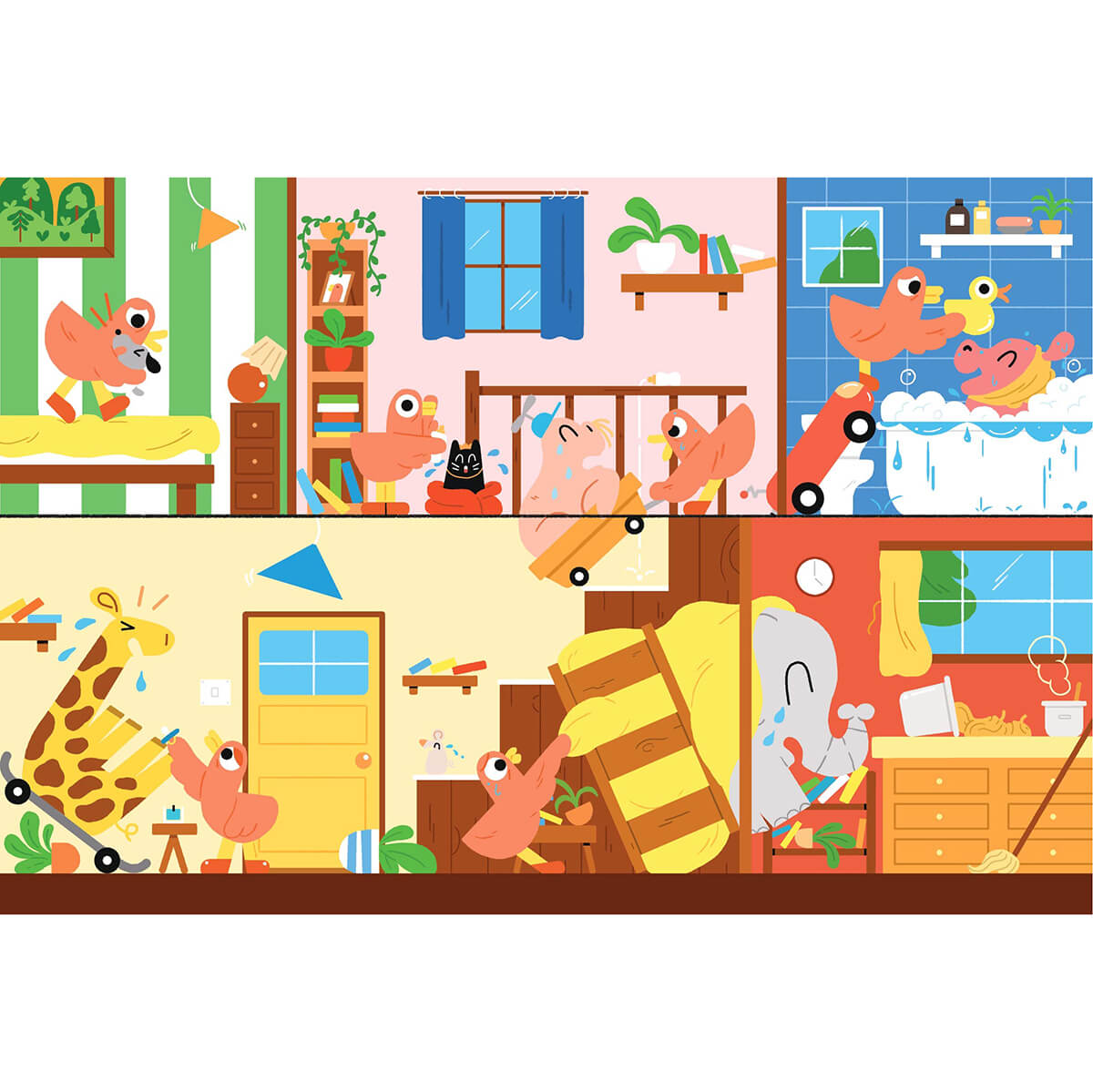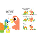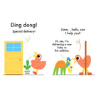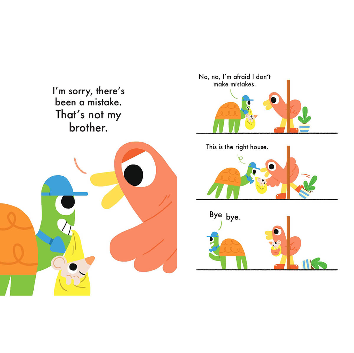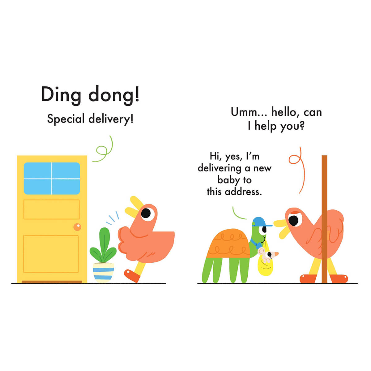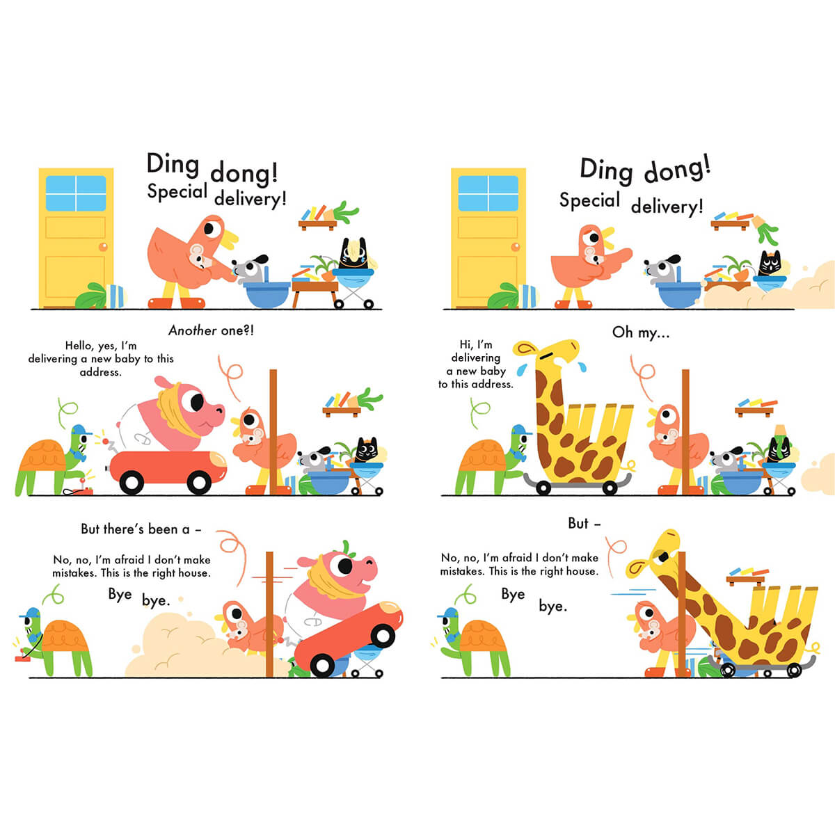 But Delivery Dude keeps bringing the wrong babies. First a baby mouse, then a kitten, then a puppy, a hippo, a giraffe and finally a baby elephant. ‘These babies are NOT my brother!’ shouts Little Duck – but Delivery Dude insists that he never makes mistakes. Little Duck’s house is filling up to the rafters when the doorbell rings again. ‘NO MORE!’ shouts Little Duck, but thankfully this time Delivery Dude is followed by his Stork boss, a load of very cross parents who have come to collect their babies... and Little Duck’s Mum and Dad. Before Stork goes he hands over one final, very special delivery.