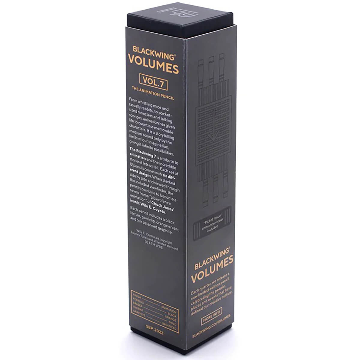 The Blackwing 7 is a tribute to Chuck Jones' animation and the incredible stories it lets us tell. Each set of 12 pencils comes with six different designs. When stacked side by side and viewed through the included viewfinder, the pencils combine to become a seven frame picket fence animation of Chuck Jones’ iconic Wile E. Coyote. Each pencil includes a black ferrule, gold clip, orange eraser, and Blackwing's balanced graphite.