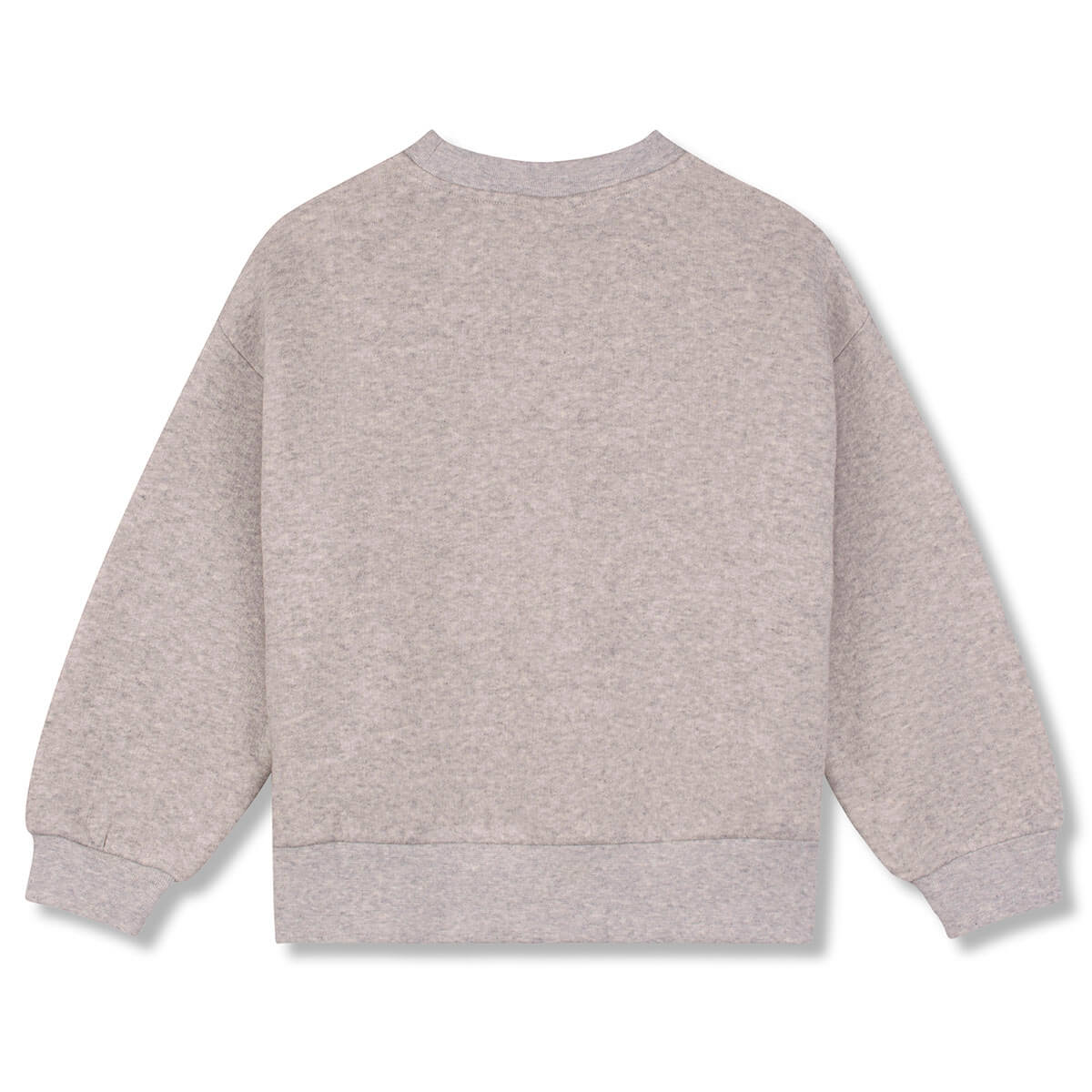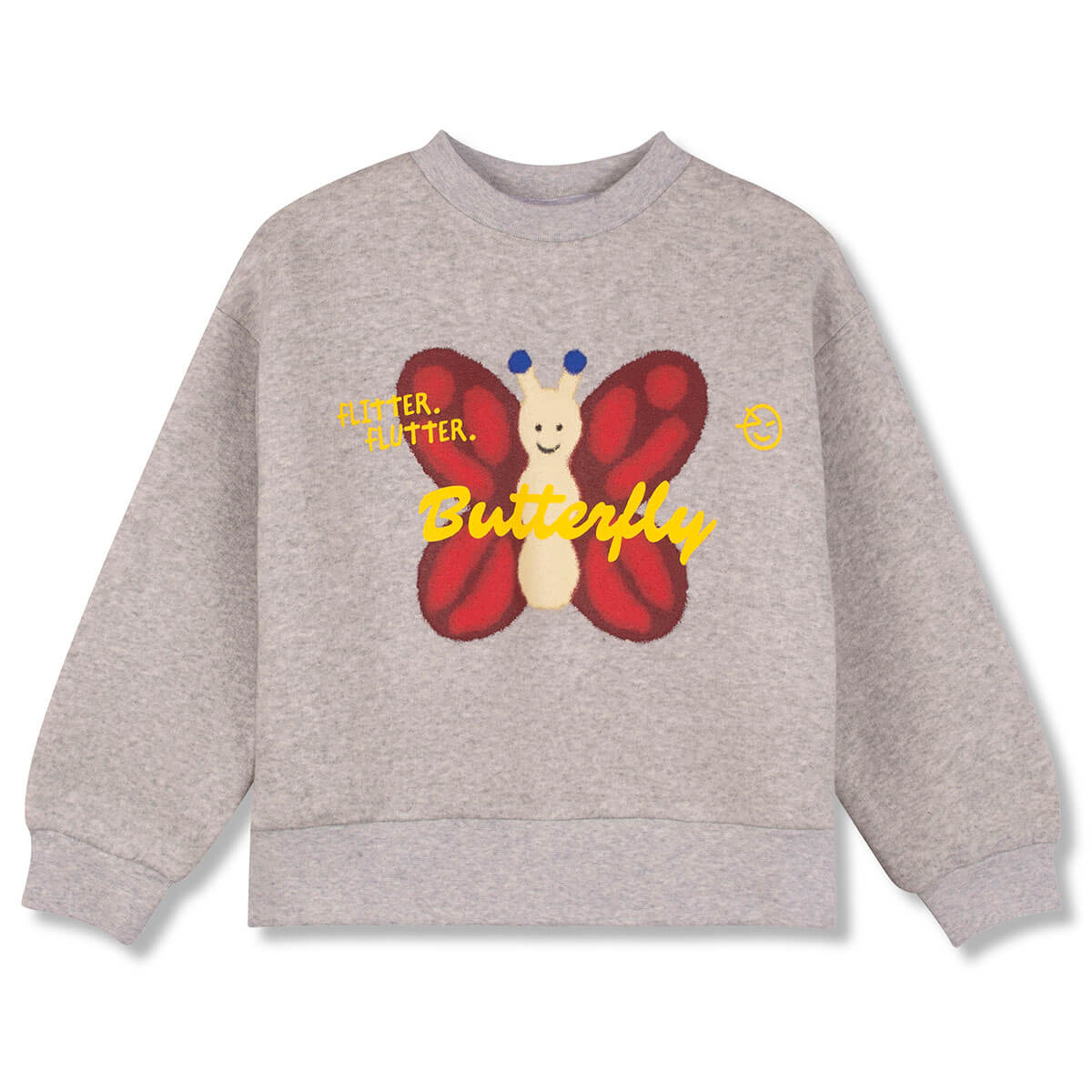 Bon Bon Sweat by Wynken. Made from a soft organic cotton-poly blend with a cosy brushed interior, this sweatshirt is built for all day comfort and play. Its slouchy, boxed fit with dropped shoulders feels relaxed and roomy, while ribbed cuffs and hem make it easy to pull on. The butterfly print with 'flitter' and 'flutter' pops against the grey melange base.