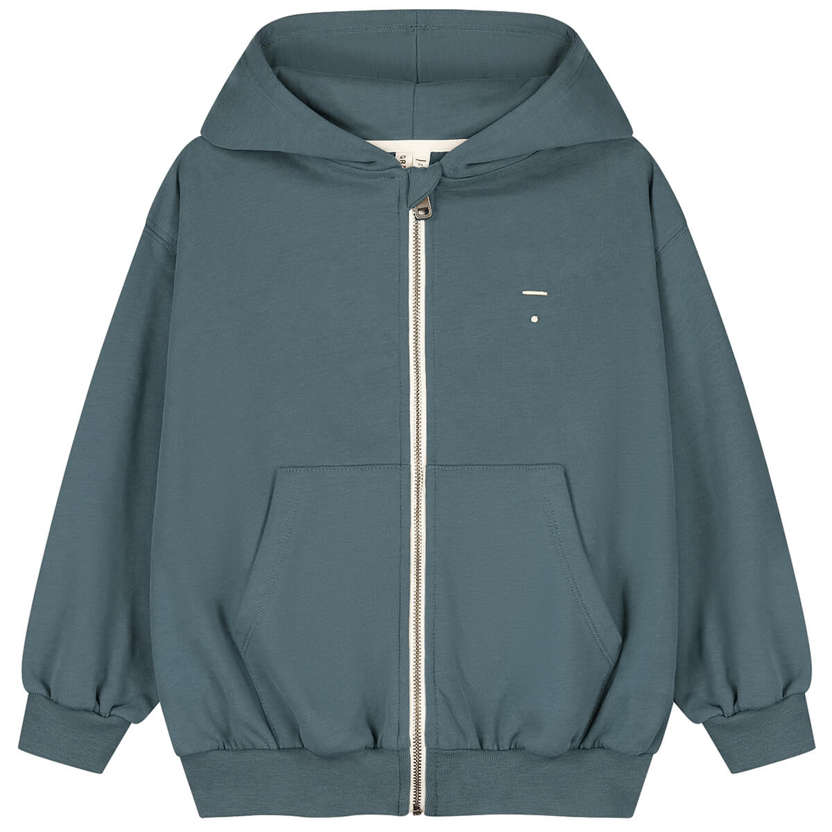 Hooded cardigan with zip by Gray Label. Long-sleeved zip front cardigan with made from soft organic cotton fleece. It has an oversized fit, dropped shoulders, hood, and ribbed cuffs and hem.