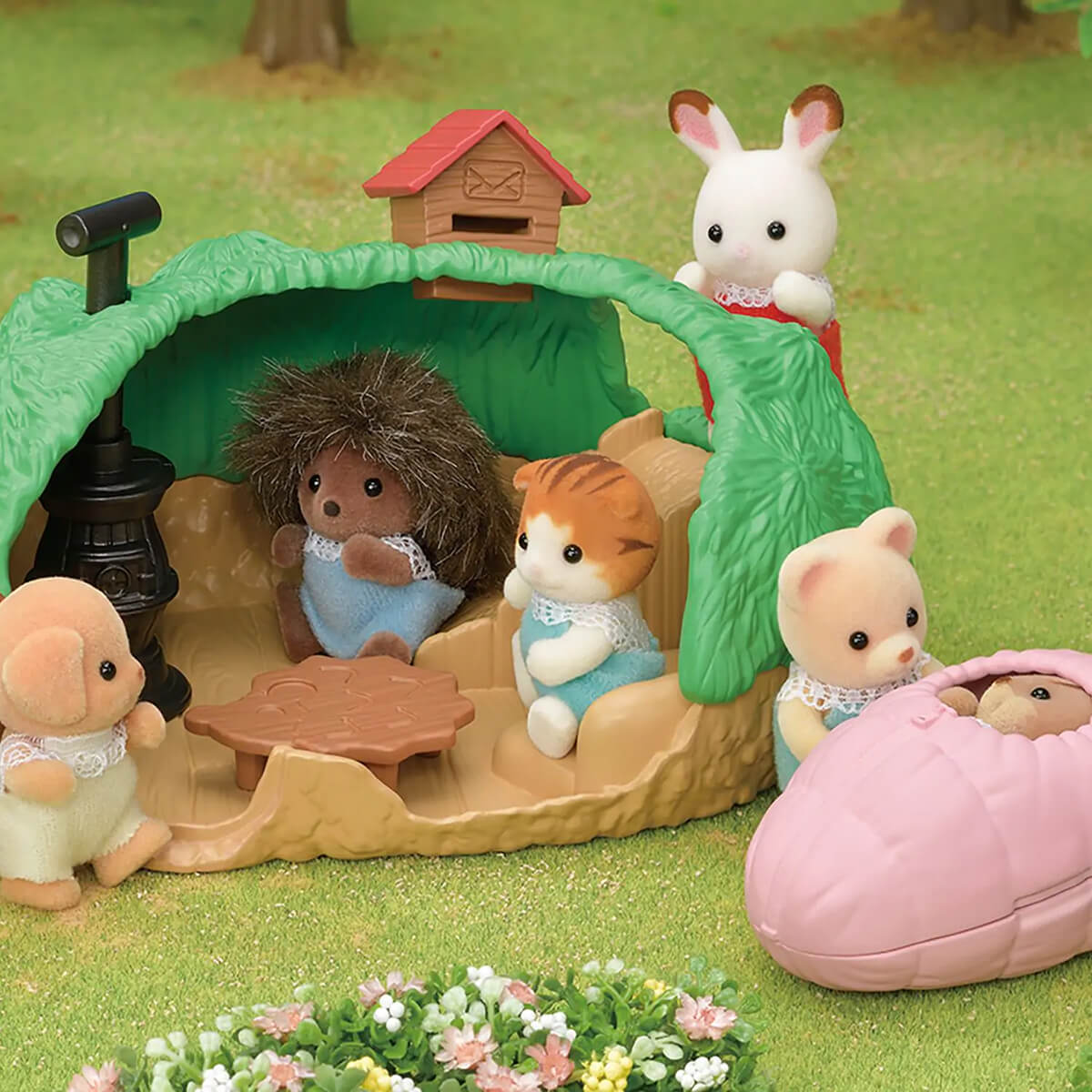 Baby Hedgehog Hideout by Sylvanian Families. Baby Hedgehog Hideout is a secret hedgehog motif house for a Hedgehog Baby. The Hedgehog Baby fits snugly into the sleeping bag. Inside the hideout is a slide, a hedgehog-shaped table, and a stove. It comes with a Hedgehog Baby figure so you can play straight away.