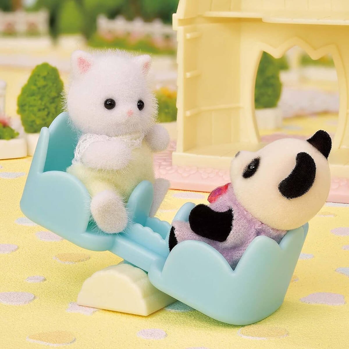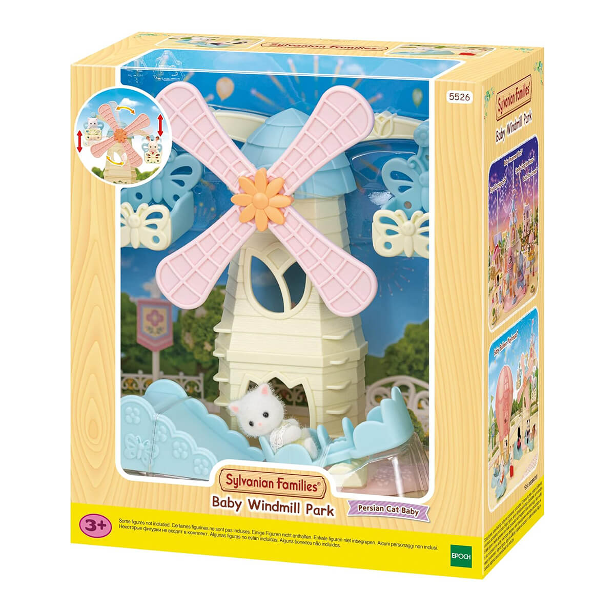 Baby Windmill Park by Sylvanian Families. The Baby Windmill Park is a playground set for babies including a windmill, butterfly gondola, flower slide and tulip seesaw. Includes a poseable Persian Cat baby dressed in removable clothing. Take a trip down the Flower slide, or wind up the windmill to make the butterfly gondola go up and down. There's so much fun to be had at the Baby Windmill Park! Winding the windmill makes the butterfly gondola go up and down. Baby figures can be placed on the gondola and seesaw.