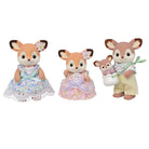Deer Family by Sylvanian Families. This set contains the Deer family in matching floral outfits: father, mother, girl and cradled baby with a sling. The figures have different colours and ear patterns! You can put the cradled baby in the flower bucket sling. The father and cradled baby are cocoa-coloured with petal-patterned ears, while the mother and girl are caramel-coloured with flower ear decorations. The grown-ups can carry the cradled baby in the flower bucket sling. Deer Father, Marius Willow, is a reliable guardian who diligently watches over his young family and his favourite past time is taking long morning walks through the forest with his baby in his arms. Deer Mother, Primrose Willow, loves to create things and the house is full of items which she has lovingly made by hand. Deer Sister, Sophia Willow, likes to write poetry and often sits on a tree stump thinking up new poems. She can also run very fast and if something catches her eye she can dash off at a speed nobody can catch up with! Deer Baby, Kai Willow, loves to lie in the field looking up at the trees blowing leaves and petals fluttering into the air.