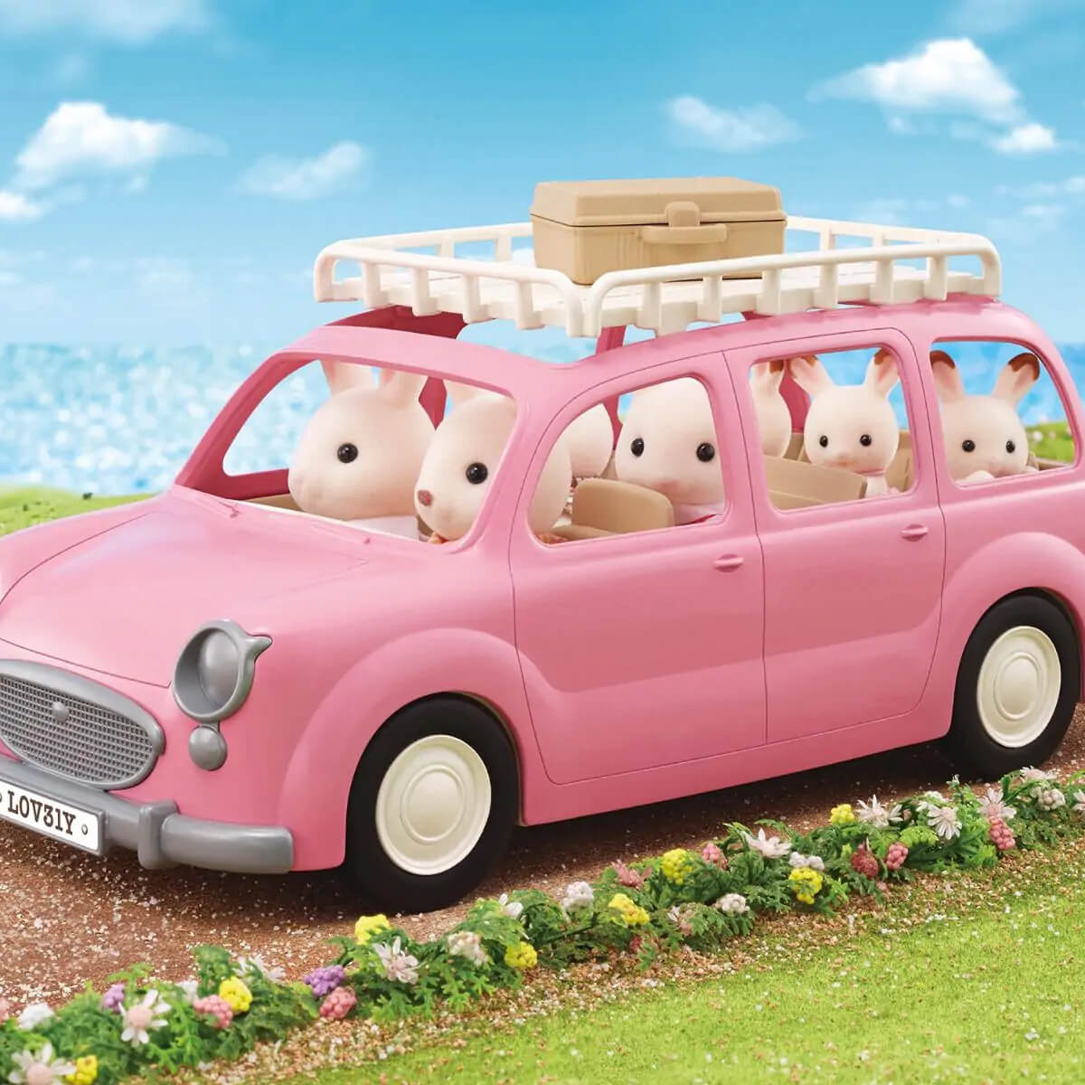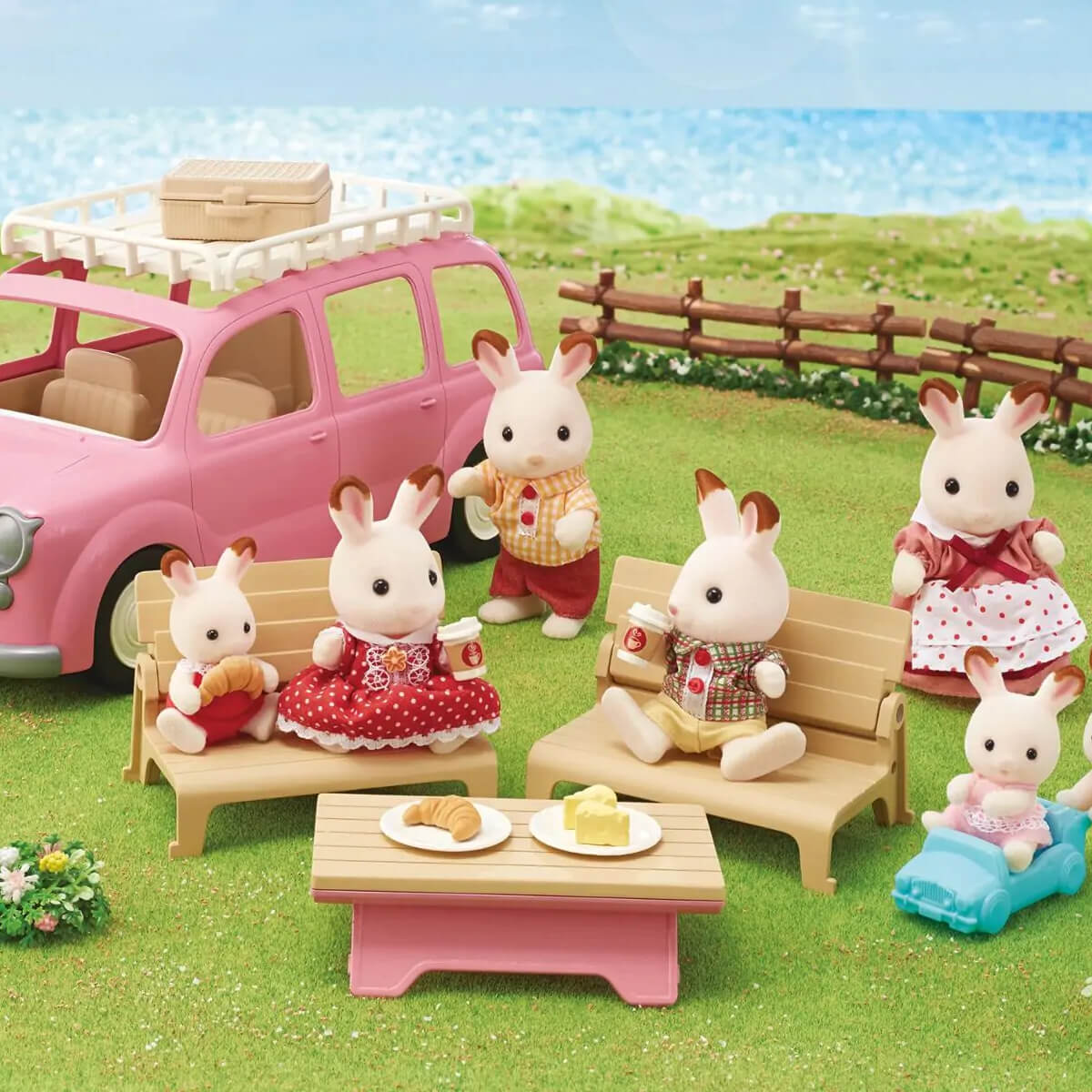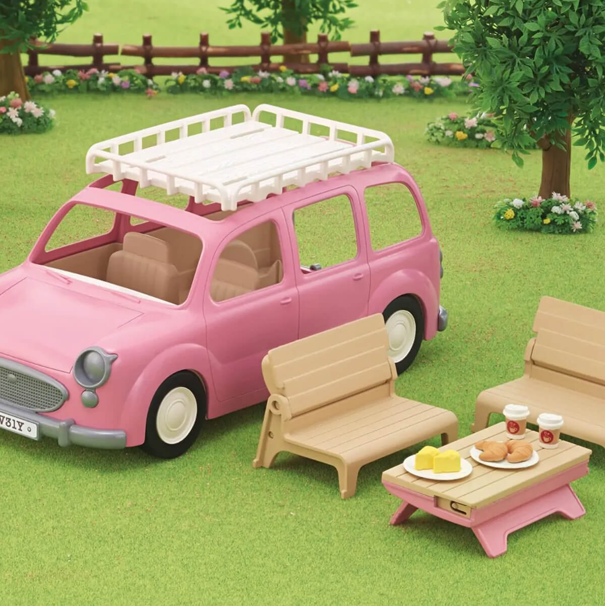 Family Picnic Van by Sylvanian Families. A new car with a roof rack, that can fit up to eight figures (sold separately). The boot door and seats turn into a picnic table set. The included plates and food can be put in the basket!