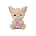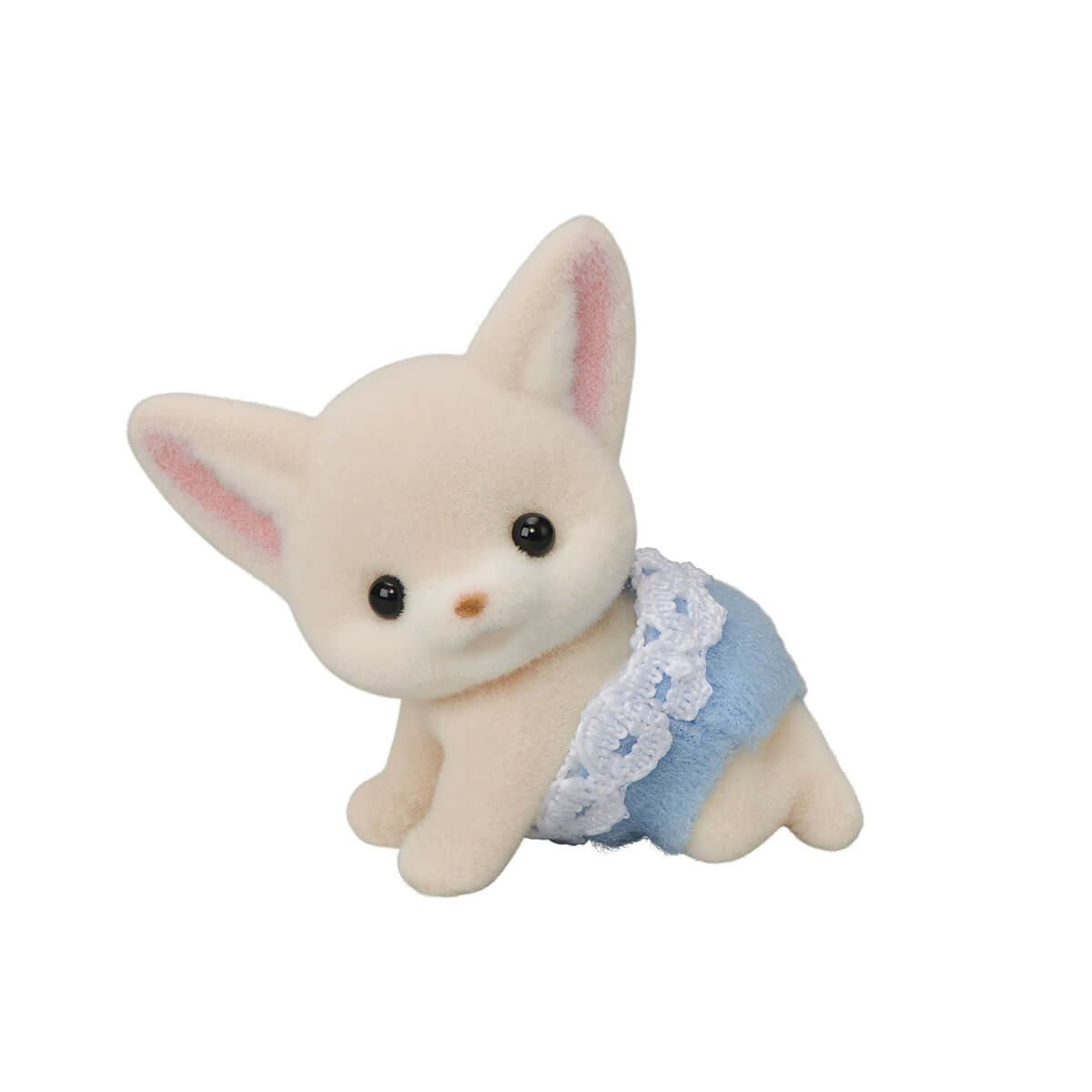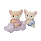 Fennec Fox Twins by Sylvanian Families. Set featuring the Fennec Fox twins, known far and wide for their big, pointy ears. Includes Fennec Fox twins Rocco (sitting) and Tara (crawling) and a pushcart. The figures' heads can be moved, and either of the twins can ride the pushcart! The included pushcart can also be attached to pushcarts from other twin sets.