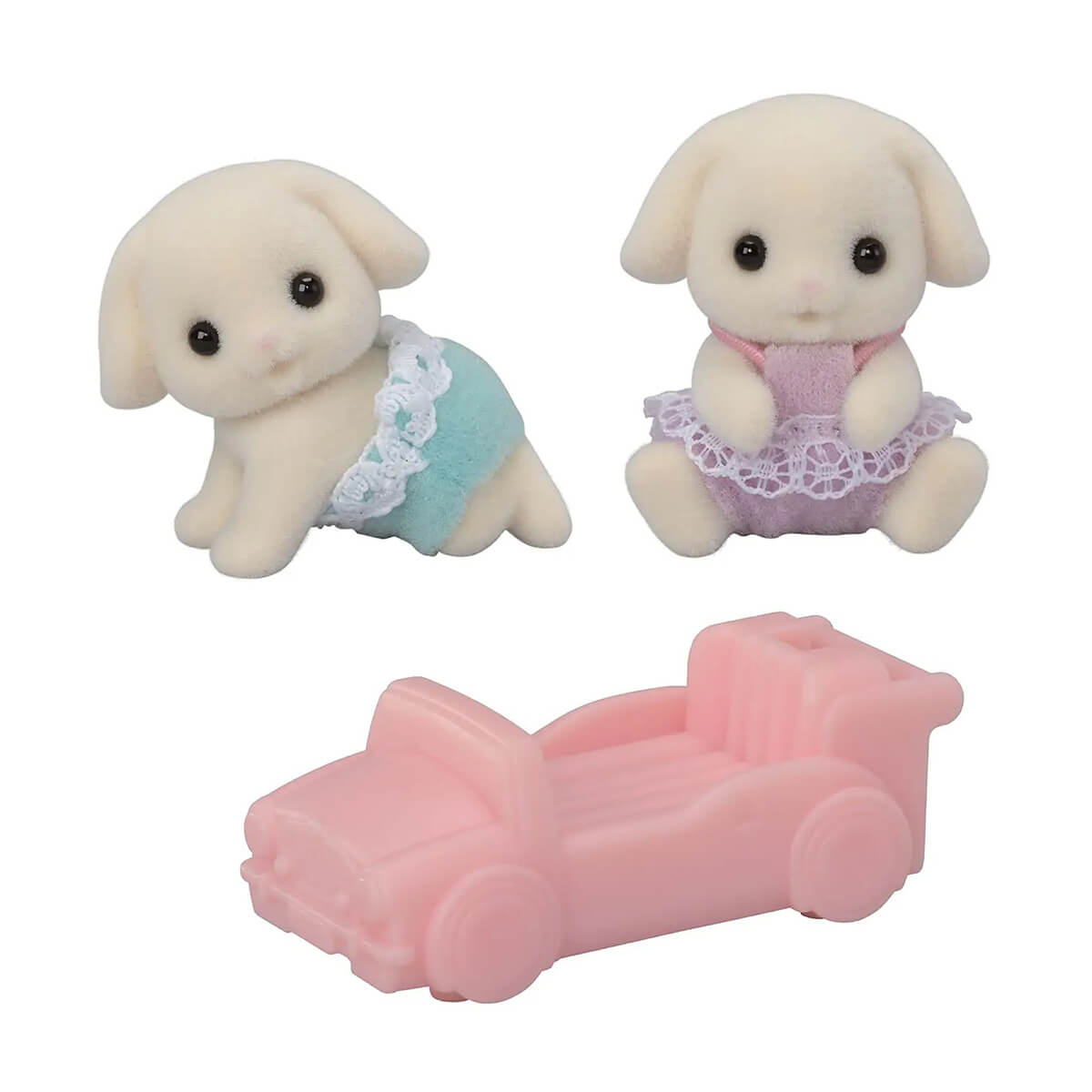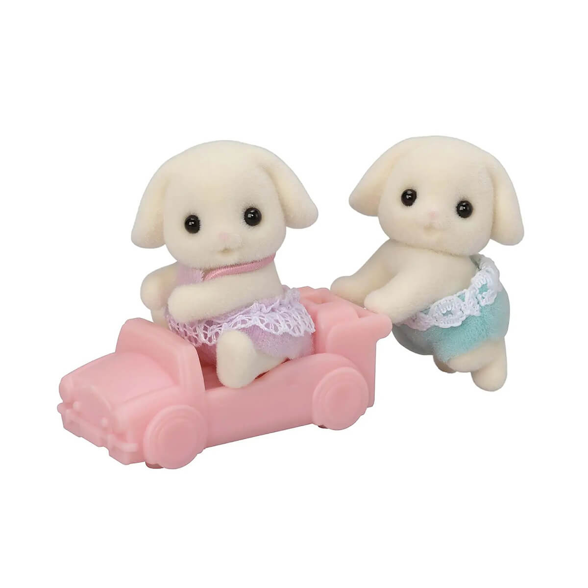 Flora Rabbit Twins by Sylvanian Families. Meet the adorable Flora Rabbit Twins! This set of two baby figures, includes Flora Rabbit Baby sister, Viola Flora, and her twin brother, Renault Flora, with their favourite ride-on train toy. Viola loves exploring with her brother, playing peek-a-boo and riding around on her little train. Renault is very cheeky and loves to chase his sister around the house getting himself into all sorts of mischief. The figures' heads can be moved, and either of the twins can ride the pushcart! The included pushcart can also be attached to pushcarts from other twin sets.