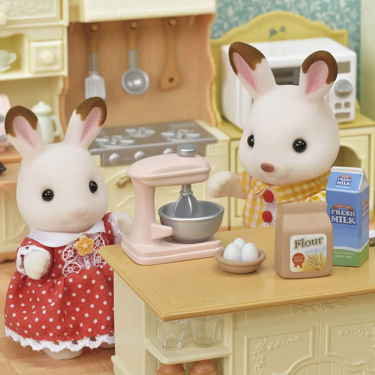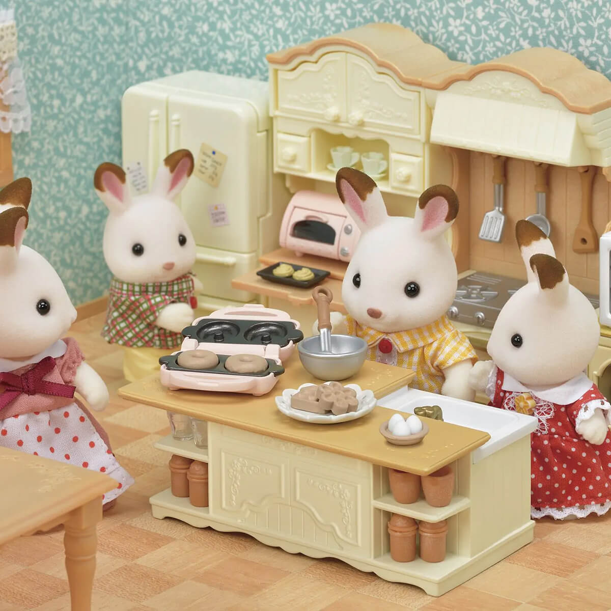 Kitchen Island by Sylvanian Families. The Kitchen Island is the perfect place to make doughnuts and waffles with the entire family. The kitchen appliances come with their own special features, such as measuring scales that move up and down, a turn-able mixer and a waffle & doughnut maker with exchangeable moulds.