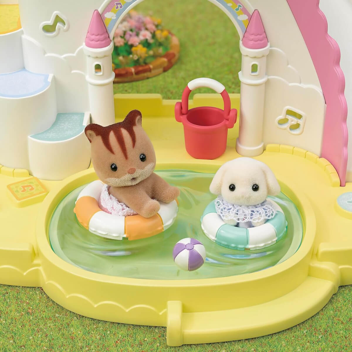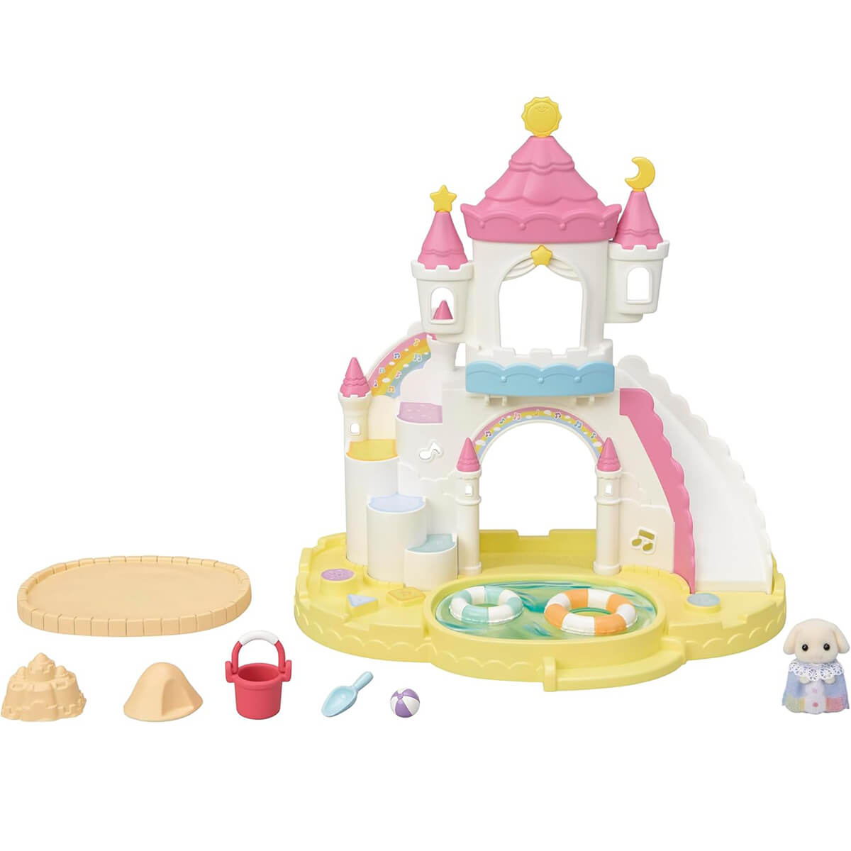 Nursery Sandbox And Paddling Pool by Sylvanian Families. Flora Rabbit baby, Thyme, is so excited about her nursery's new sandpit and paddling pool. It is the perfect place for Thyme and her friends to play whilst getting very messy indeed. The castle has little windows where the babies can peek out as well as a big slide the babies can go down which lands right in the pool! With a quick swap the pool can become an amazing sandbox. This fantastic new set includes an exclusive Flora Rabbit cradled baby figure and comes with some cute toys for playing in the sandpit and pool, such as a bucket, scoop, beach ball and swimming rings.