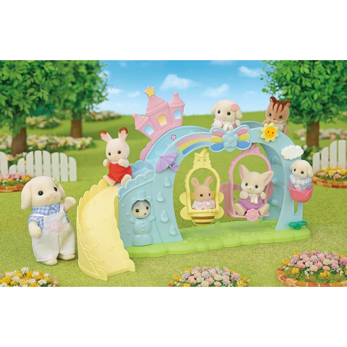 The set includes: Main Unit, Slide, Butterfly Swing, Bee Swing, Tower Decoration, Tulip Lift and Milk Rabbit Cradled Baby Figure.