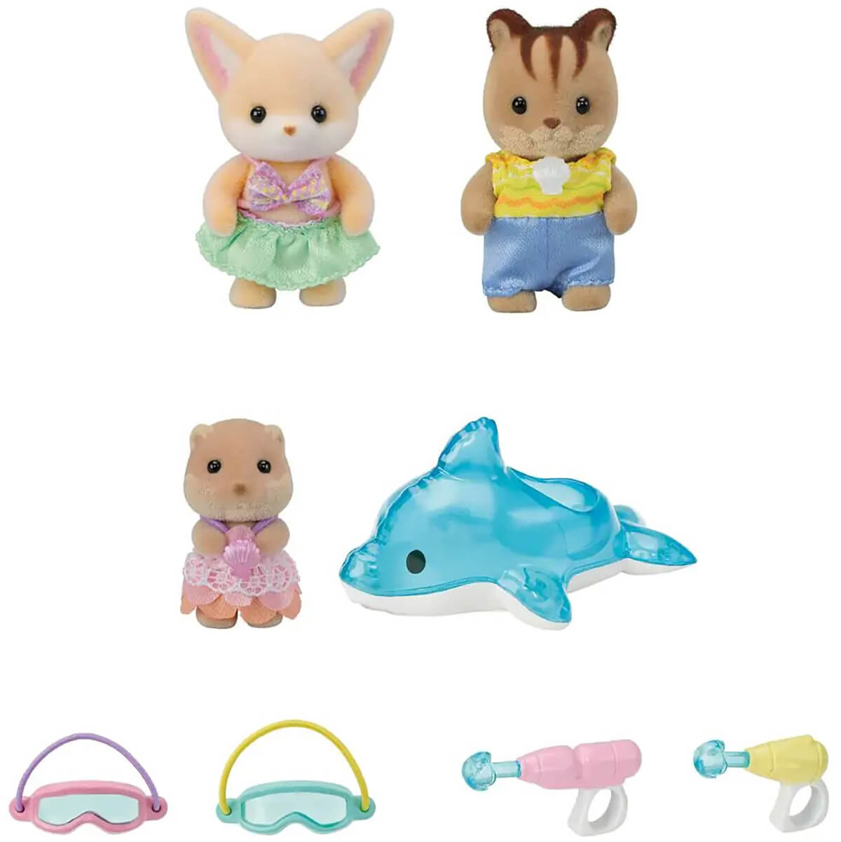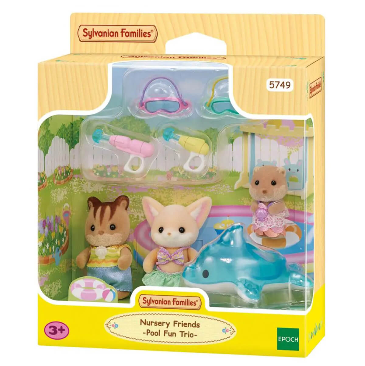 Pool Fun Trio Nursery Friends by Sylvanian Families. Nursery friends Fennex Fox baby Yulie, Walnut Squirrel baby Ambrose and Splashy Otter baby Nicola are ready for a fun-filled day at the pool! This fantastic set includes all three figures together with a number of fun swimming accessories, such as an inflatable dolphin, pool toys and goggles.