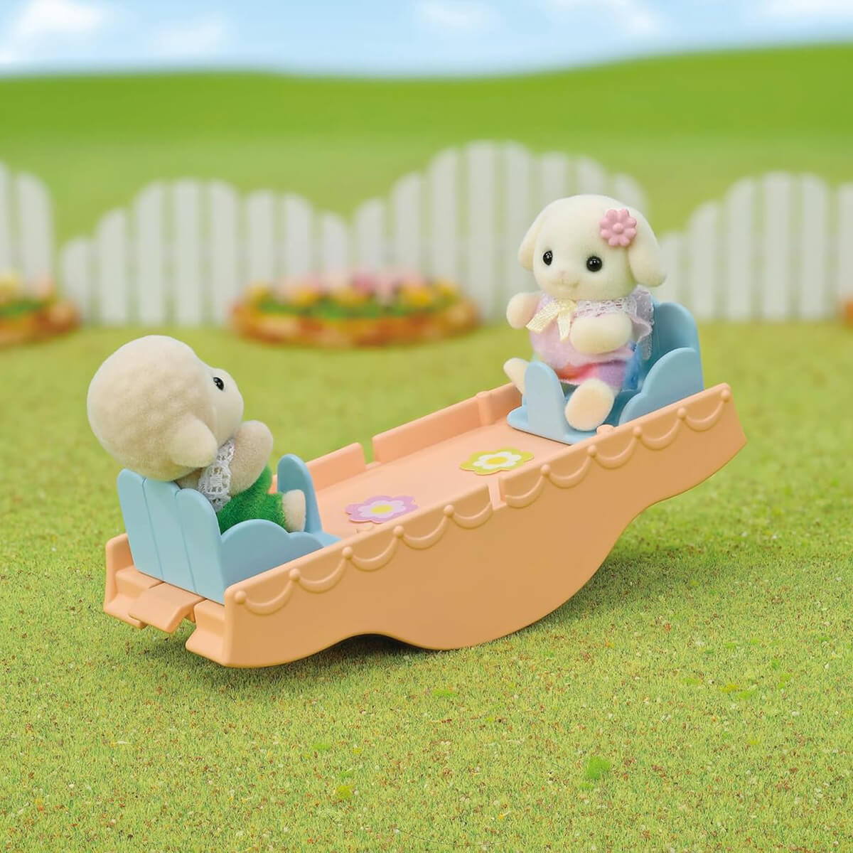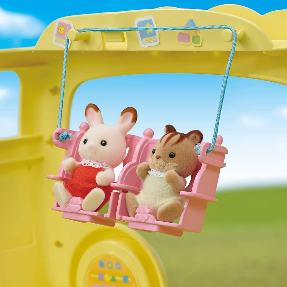 Rainbow Fun Nursery Bus by Sylvanian Families. This brightly coloured bus is the perfect way to get your Sylvanian's off to school each day. With the Rainbow Fun Nursery Bus, your Sylvanian Families babies will be having heaps of fun before they even arrive at nursery! The triple-decker bus seats a total of 28 baby figures (including cradled babies) and can also fold out into a fun-filled play area. Each of the bus seats can be removed and used as piece of playground equipment, including a merry-go-round, swing, slide, see-saw and stroller carriage. The ropes of the swing can be used as seatbelts on the bus to make sure those babies are safe.