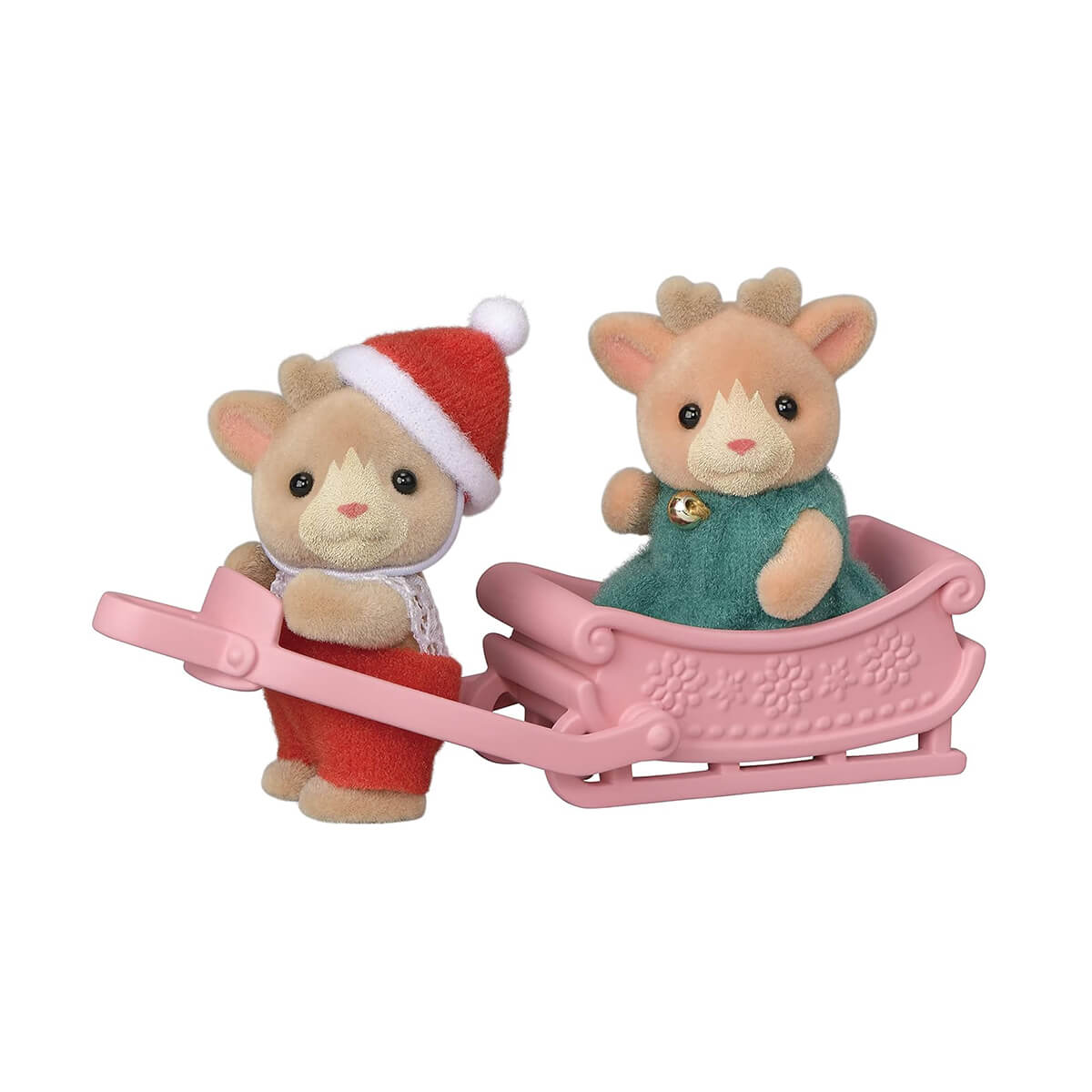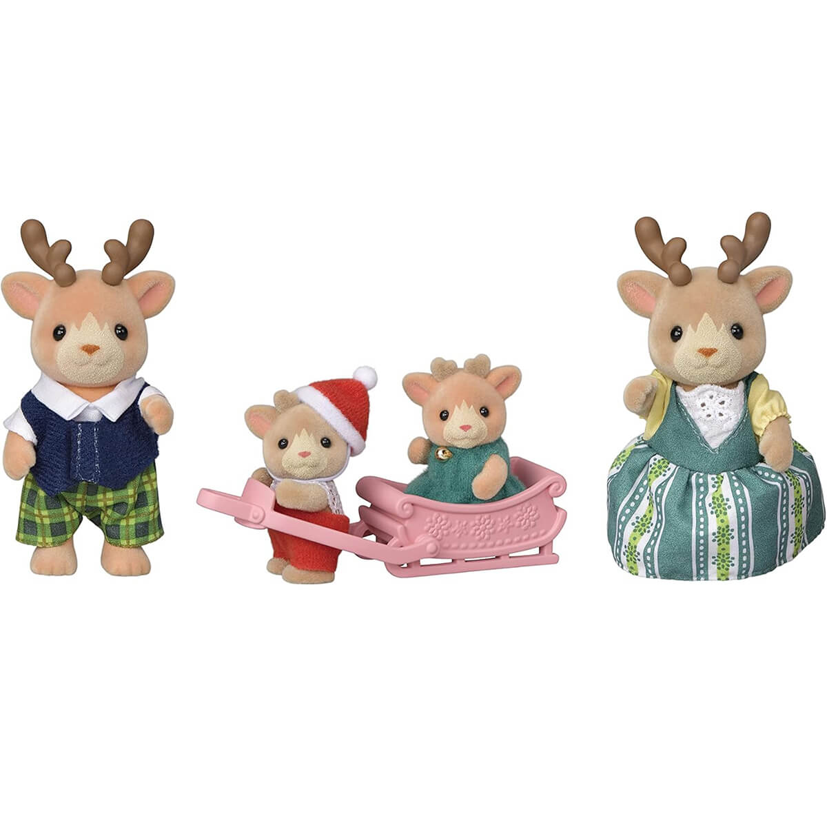 Reindeer Family by Sylvanian Families. Introducing the Snowdrifts, a family of Reindeer with gorgeous antlers. Father, Jolly Snowdrift, is the local delivery man bringing anything from presents to food he carries them everywhere but he can often be careless and makes mistakes with delivery addresses. Mother, Elm Snowdrift, is always helping her husband with his deliveries and is full of ideas, even if a parcel seems heavy she will find a way to carry it and loves working with her family. Babies, Luis and Eve Snowdrift, love Christmas so much they wear red and green all year round! To help their father with his work they use their sled as a trolley for deliveries as well as to play games. Each figure has poseable arms, legs and head plus the fabric clothing can be removed to change outfits. The included sleigh can be attached to the other pushcarts in the range for extra play value.