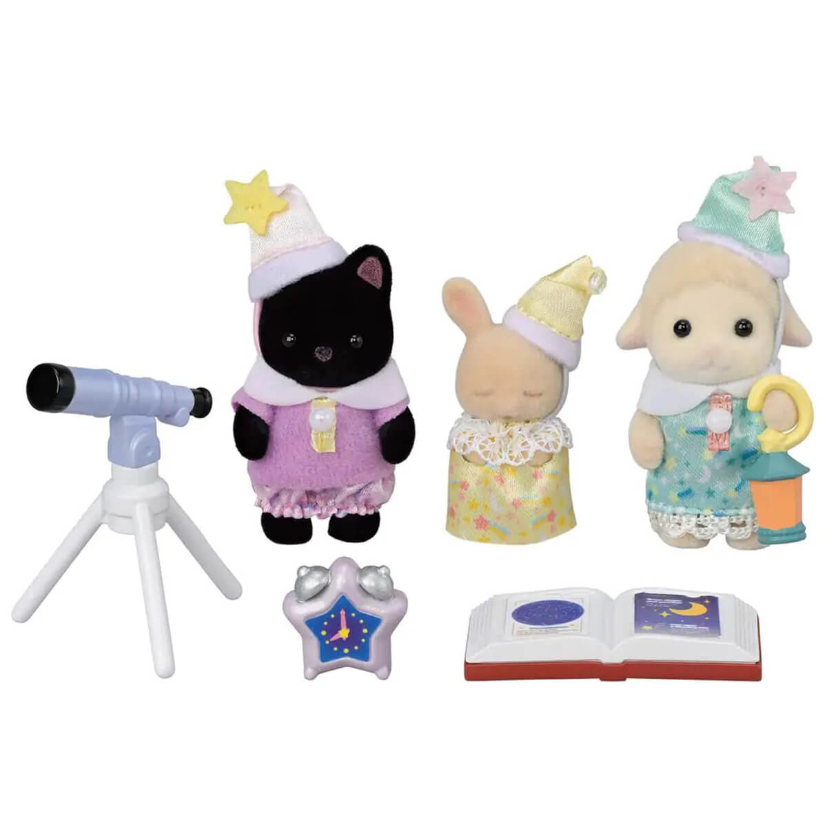 Sleepover Trio Nursery Friends by Sylvanian Families. Dressed in their adorable new pyjamas with cute star patterns, Midnight Cat baby Gloria, Sheep baby Emma and Milk Rabbit baby Iris are ready to search for the stars. Their lantern is also the perfect accessory to be able to find their way through the dark nights whilst their telescope and constellation book helps them identify which stars they have spotted.
