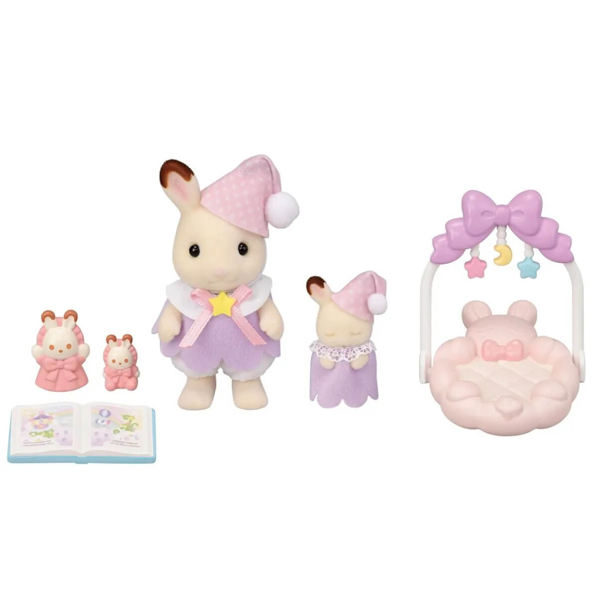 Sleepy Dream Siblings by Sylvanian Families. Get ready for pyjama party fun with the Chocolate Rabbit sisters! This adorable set features Freya and Flora Chocolate in an exclusive set of matching pyjamas and nightcaps, each cuddling their own bunny toy. The set also features a baby carrier with moveable handle and a built in crib mobile, perfect for bedtime stories. Flora, the cradled baby, has a unique sleeping expression making her ideal for nighttime role play. A storybook is also included so that big sister, Freya, can wind down before bed by reading to her baby sister. The adorable baby gym with a mobile will lull the cradled baby to sleep. The Chocolate Rabbit cradled baby has a special sleeping design with her eyes closed. The girl and cradled baby are wearing matching pajamas with night caps. The puppet can be placed on the girl's hand.