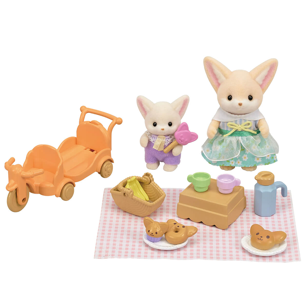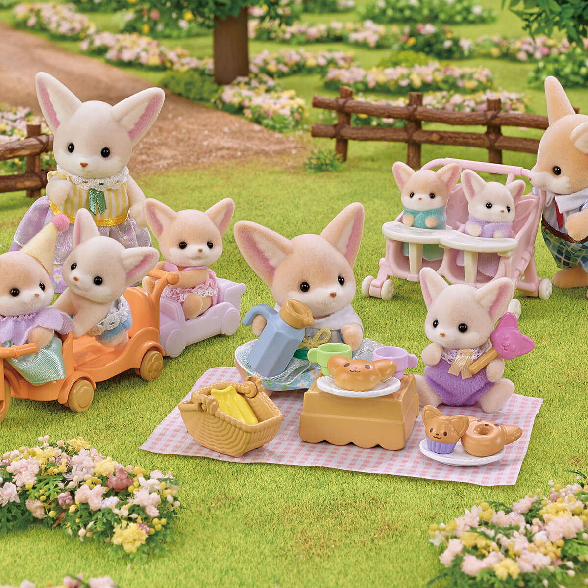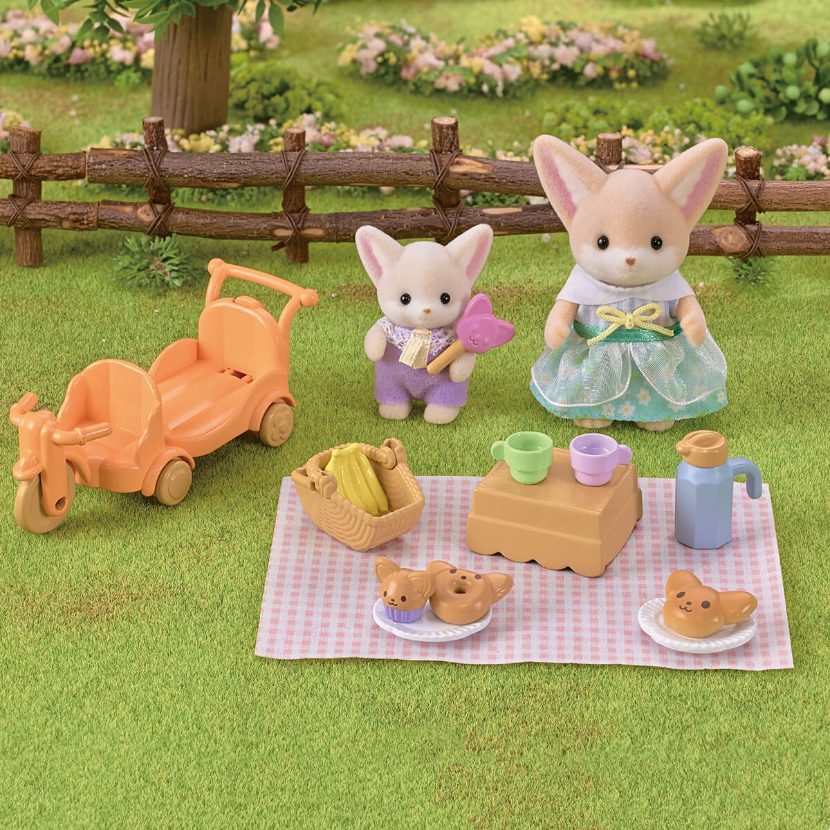 Sunny Picnic Set by Sylvanian Families. The Fennec Fox family are known far and wide for their big pointy ears. This set introduces new Sylvanian characters: the Fennec Fox girl Jasmine and her baby brother Caleb, along with a pushcart and picnic equipment. The picnic is complete with Fennec Fox shaped buns, doughnuts, candy sticks and cupcakes. The pushcart basket can be removed to make enough room for the baby to ride it as well.