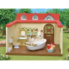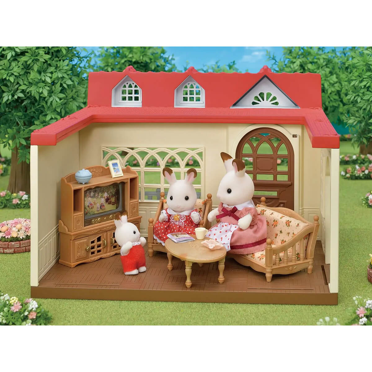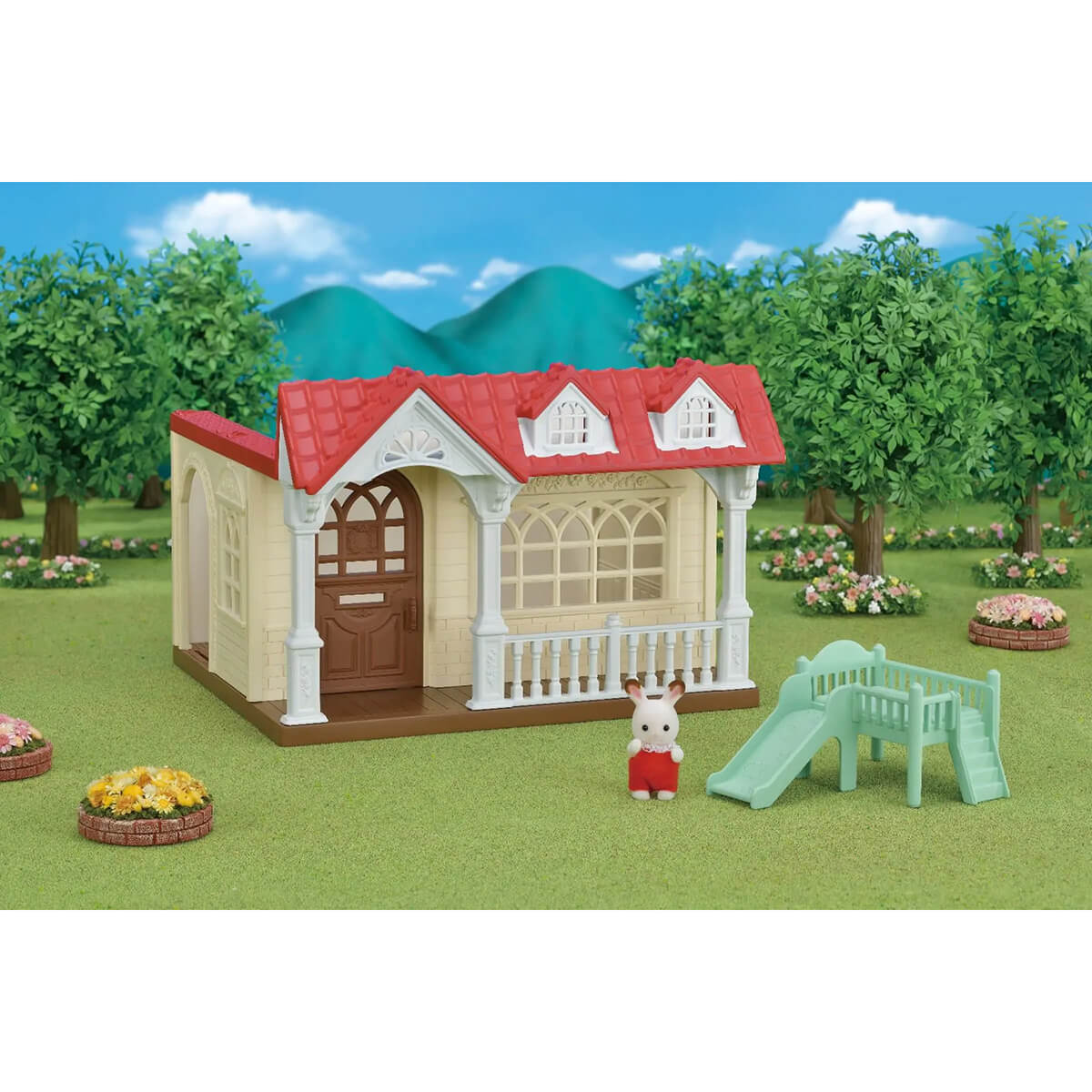Sweet Raspberry Home by Sylvanian Families. This cute little home is the ideal start to your journey of developing your very own Sylvanian Families village. The one-storey house has an amazing entrance terrace with an opening door, red roof and sweet window details. It comes with Chocolate Rabbit Baby and a baby bed with a slide, so you can play with this set right away. With its large interior and high ceiling, hands can fit inside for easy play. It can be combined with the Red Roof Cosy Cottage and other products to make extravagant large Homes for your Sylvanian Families.