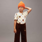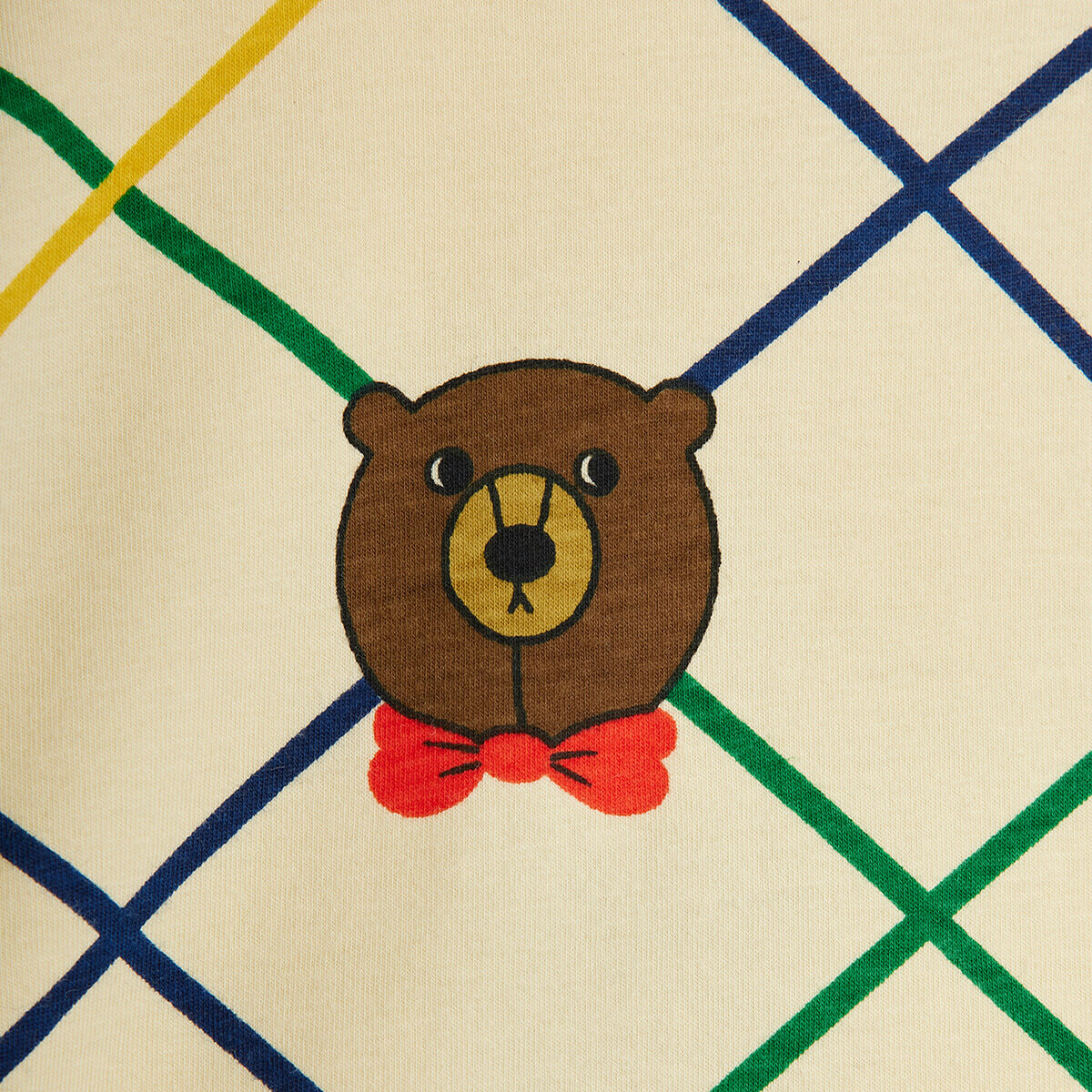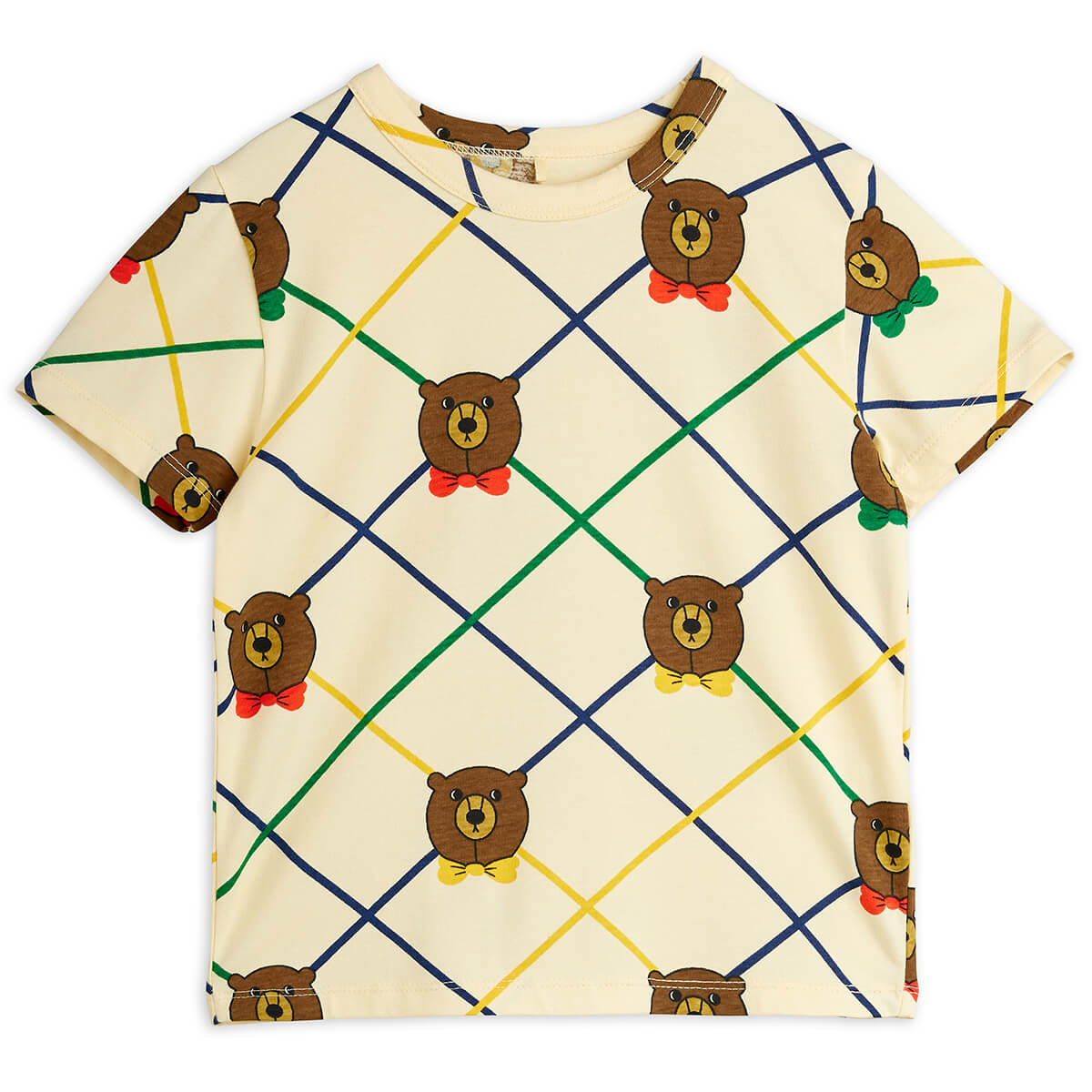 Bear Check AOP Tee by Mini Rodini. Off white t-shirt designed with a slim fit and a tie at the neck.