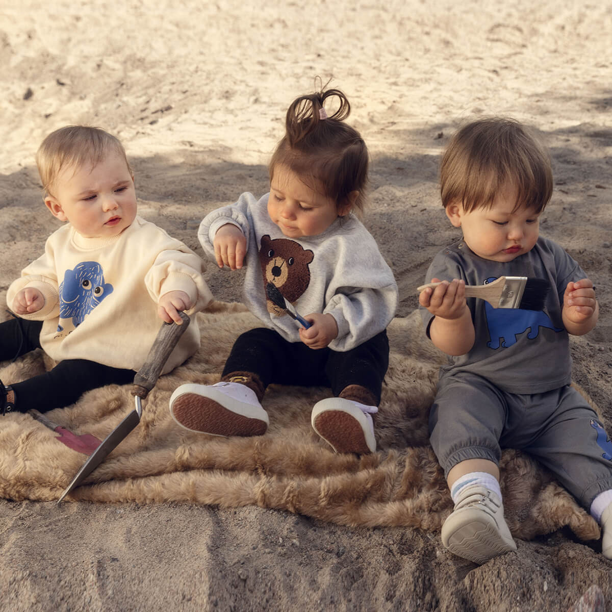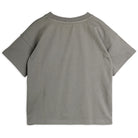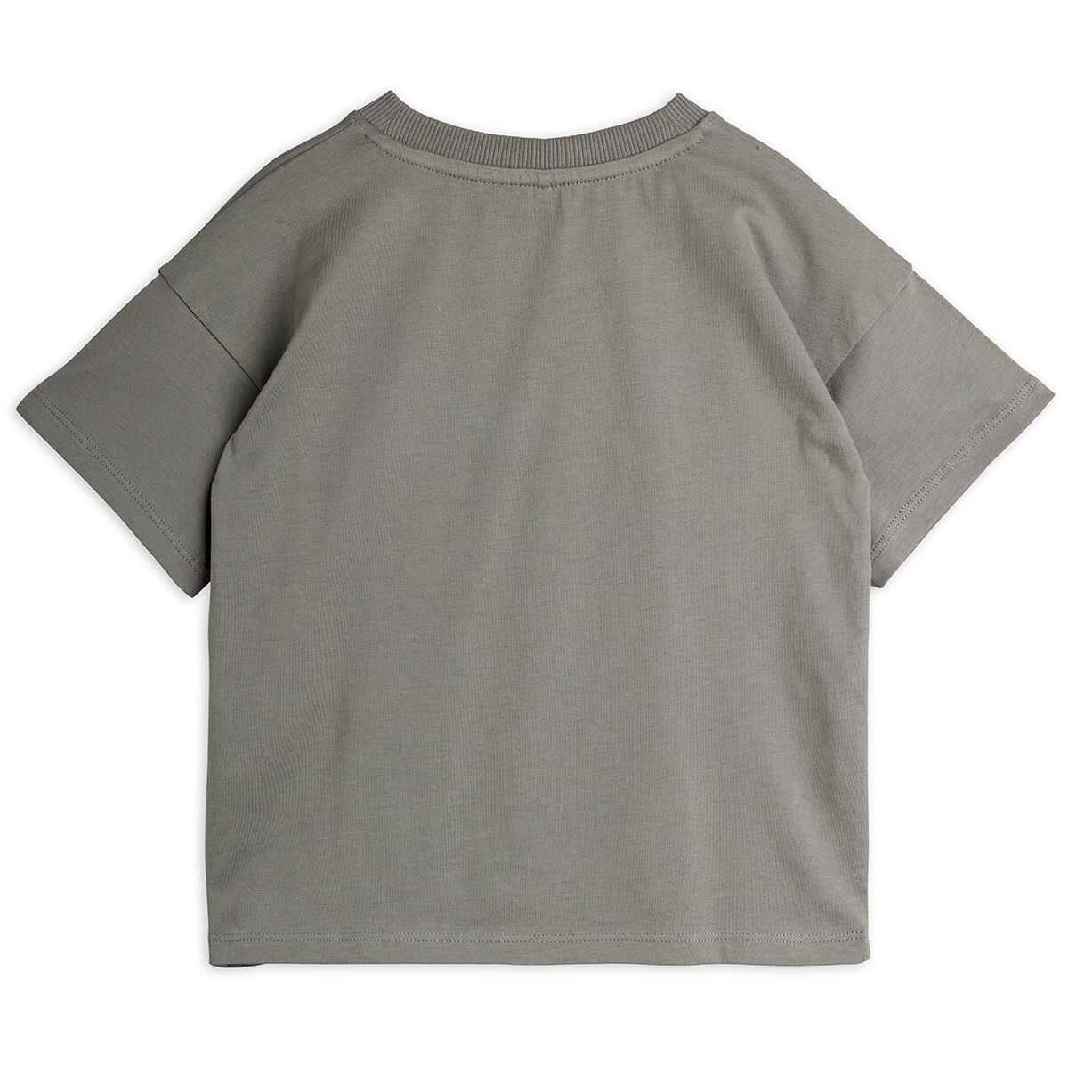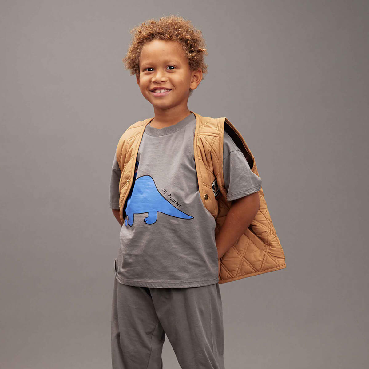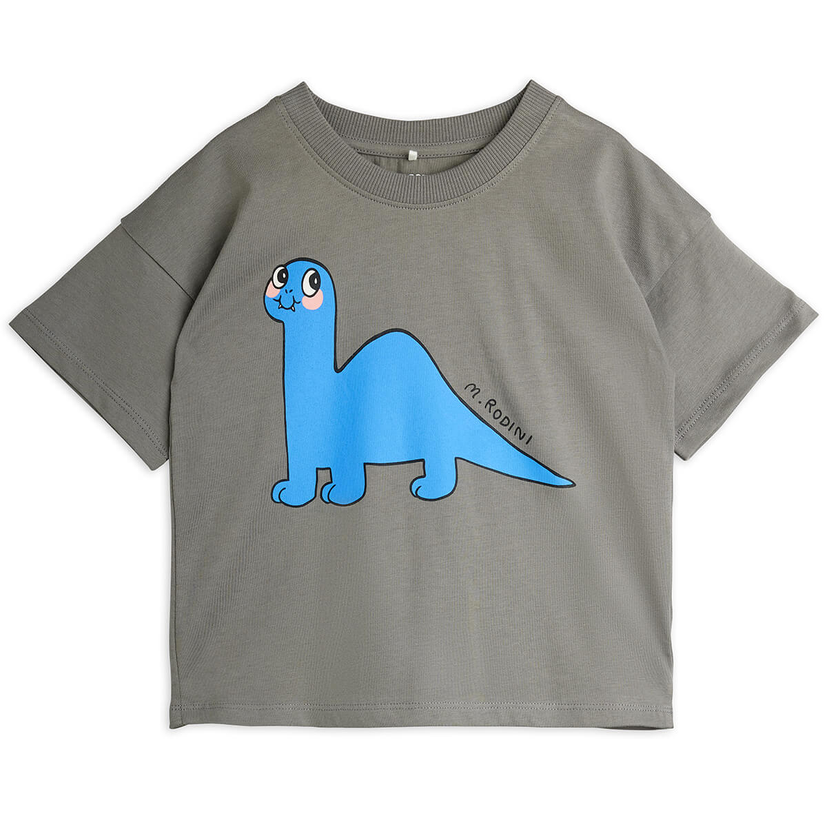 Dino Tee by Mini Rodini. Grey t-shirt, designed with a loose fit, dropped shoulders ribbed neck and a large dino print.