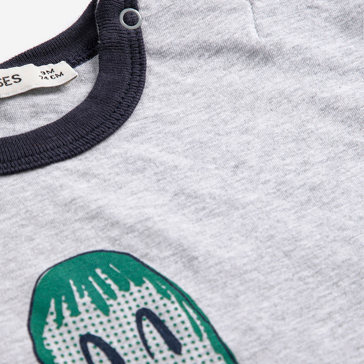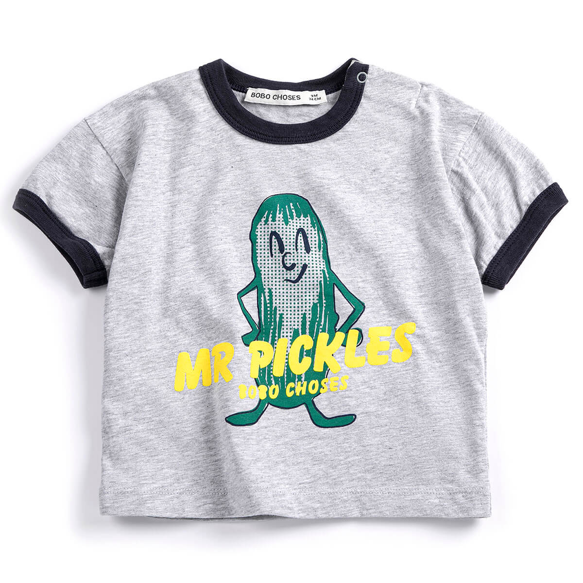 Mr Pickles Baby T-Shirt by Bobo Choses. Heather grey tee featuring a playful mr pickles print and contrast neckline and sleeve hems. Designed with short sleeves, dropped shoulder, shoulder snap fastening, loose fit and round neck.