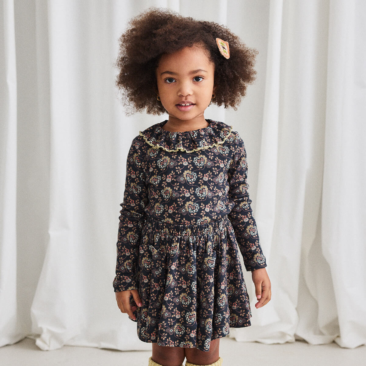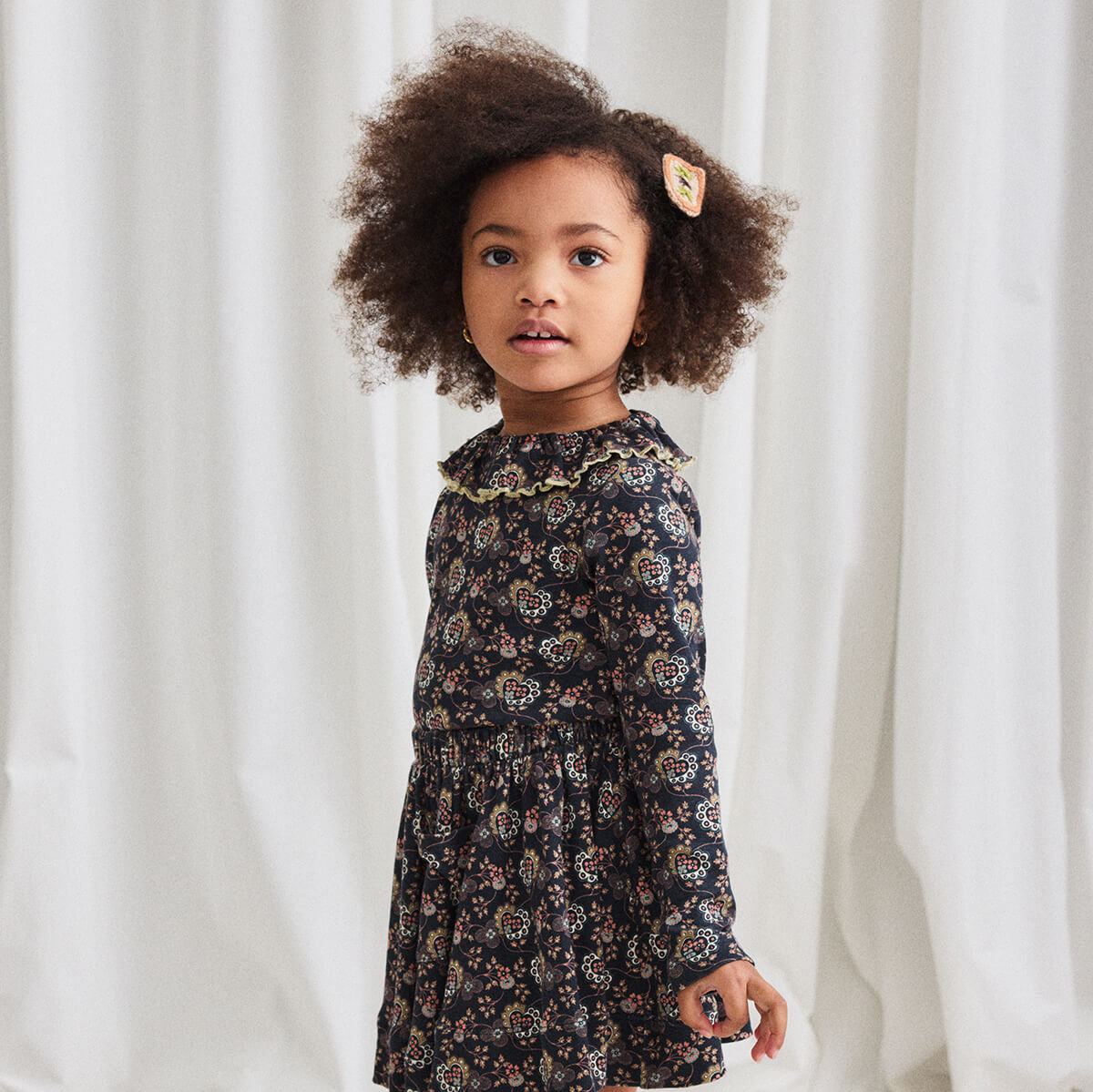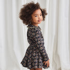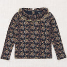 Paloma Top by Misha & Puff. A long-sleeved slim-fit top in soft organic Pima cotton, featuring a gathered ruffle neck with contrast merrowed edge and snap closure at the back neck.