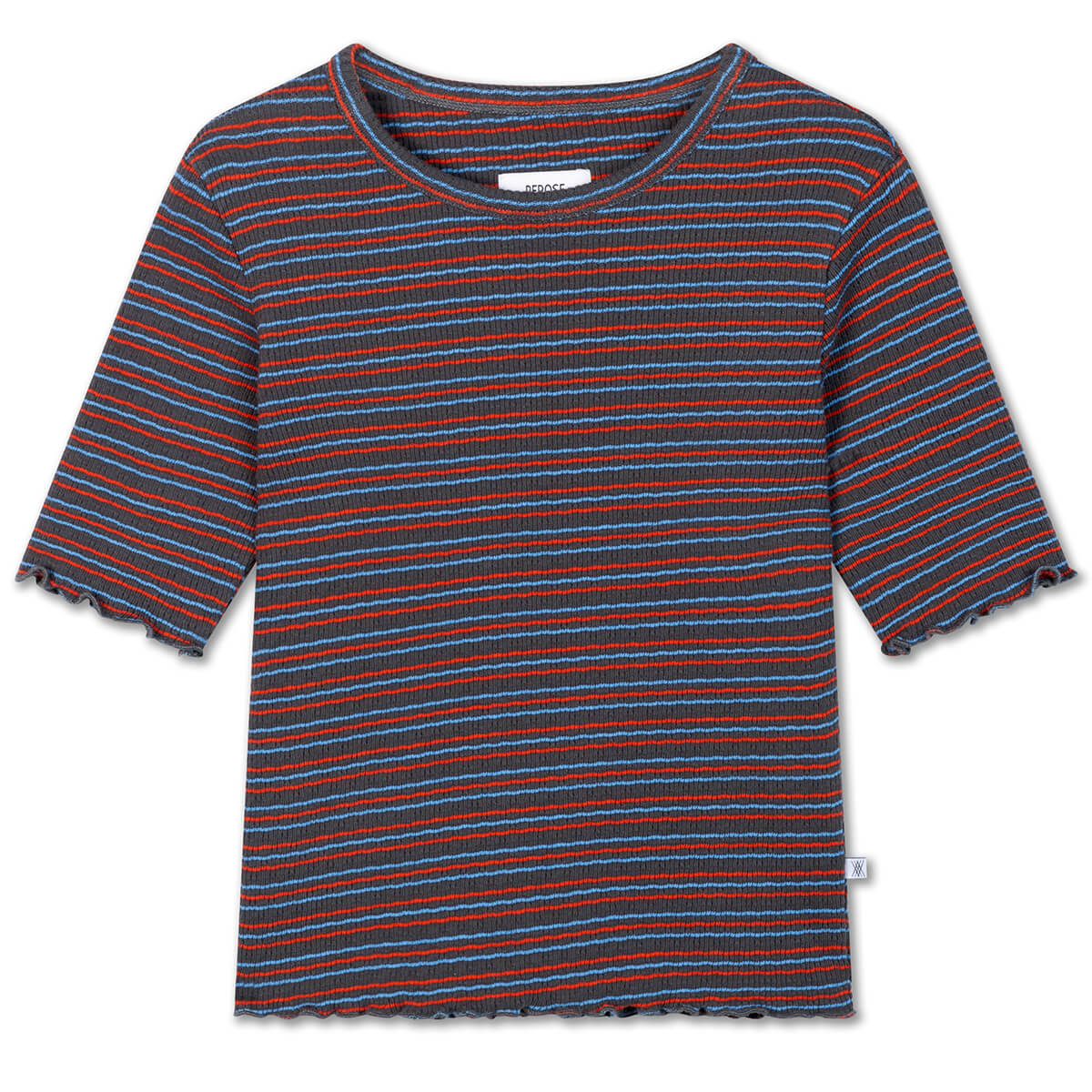 Slim Tee by Repose AMS. Crafted from organic fancy ajour cotton, the slim tee in fine grey siesta stripe has a soft, textured feel with a delicate, breathable pattern. This short-sleeved piece is designed with a ruffled finish at the sleeves and bottom hem and features a comfortable, snug fit. Perfect for layering or wearing on its own.