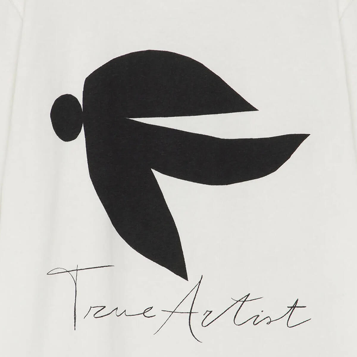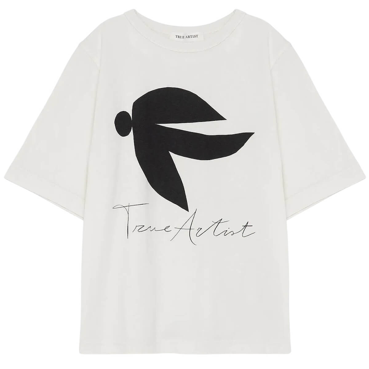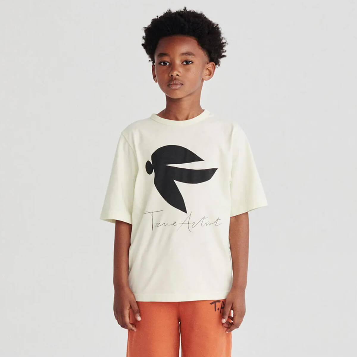 T-shirt by True Artist. T-shirt nº05 in Ecru Cream is made of 100% organic cotton and features a seasonal textured bird logo printed on the front. It has a round neck, short sleeves and a relaxed fit. Made in Spain.