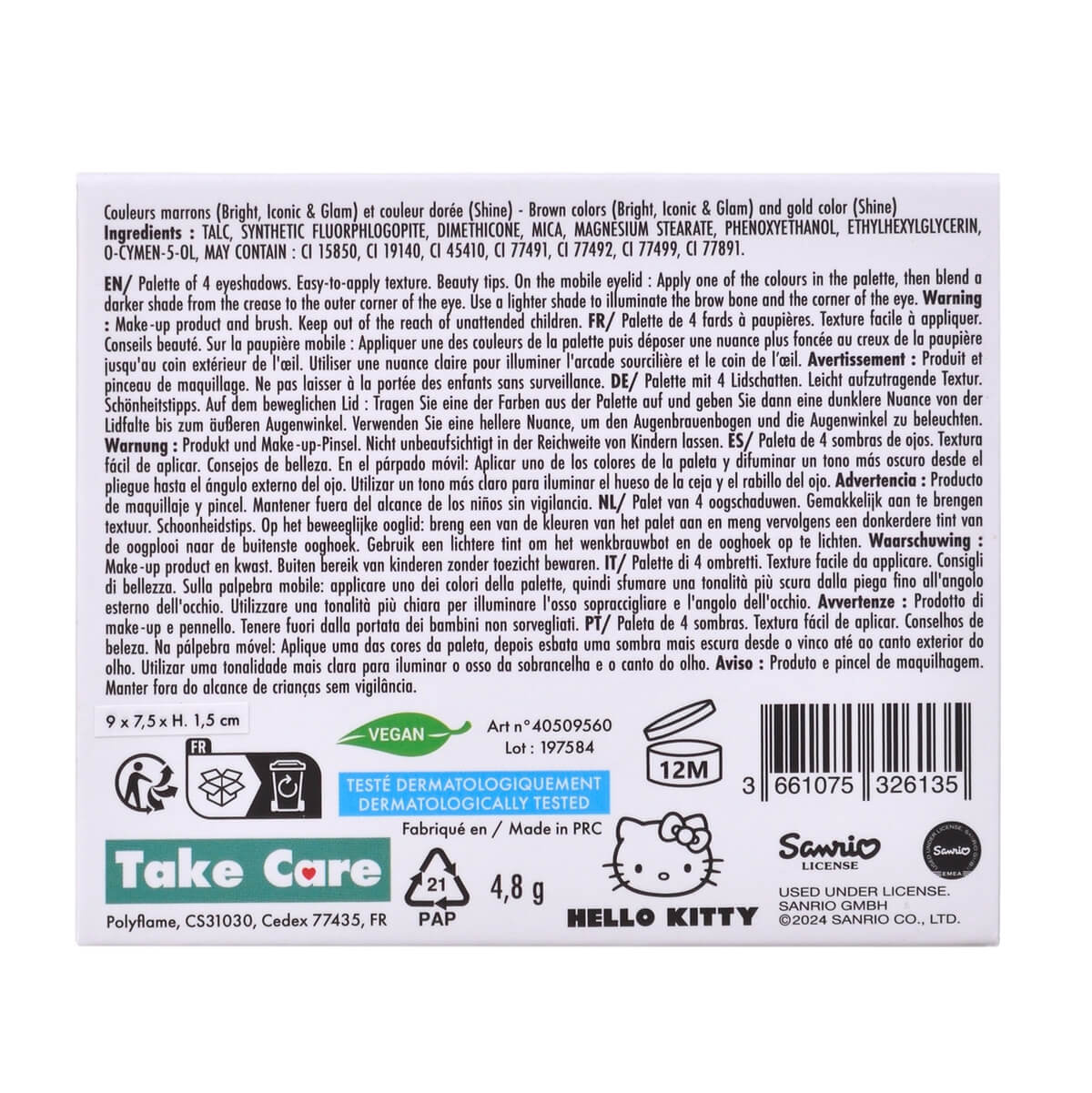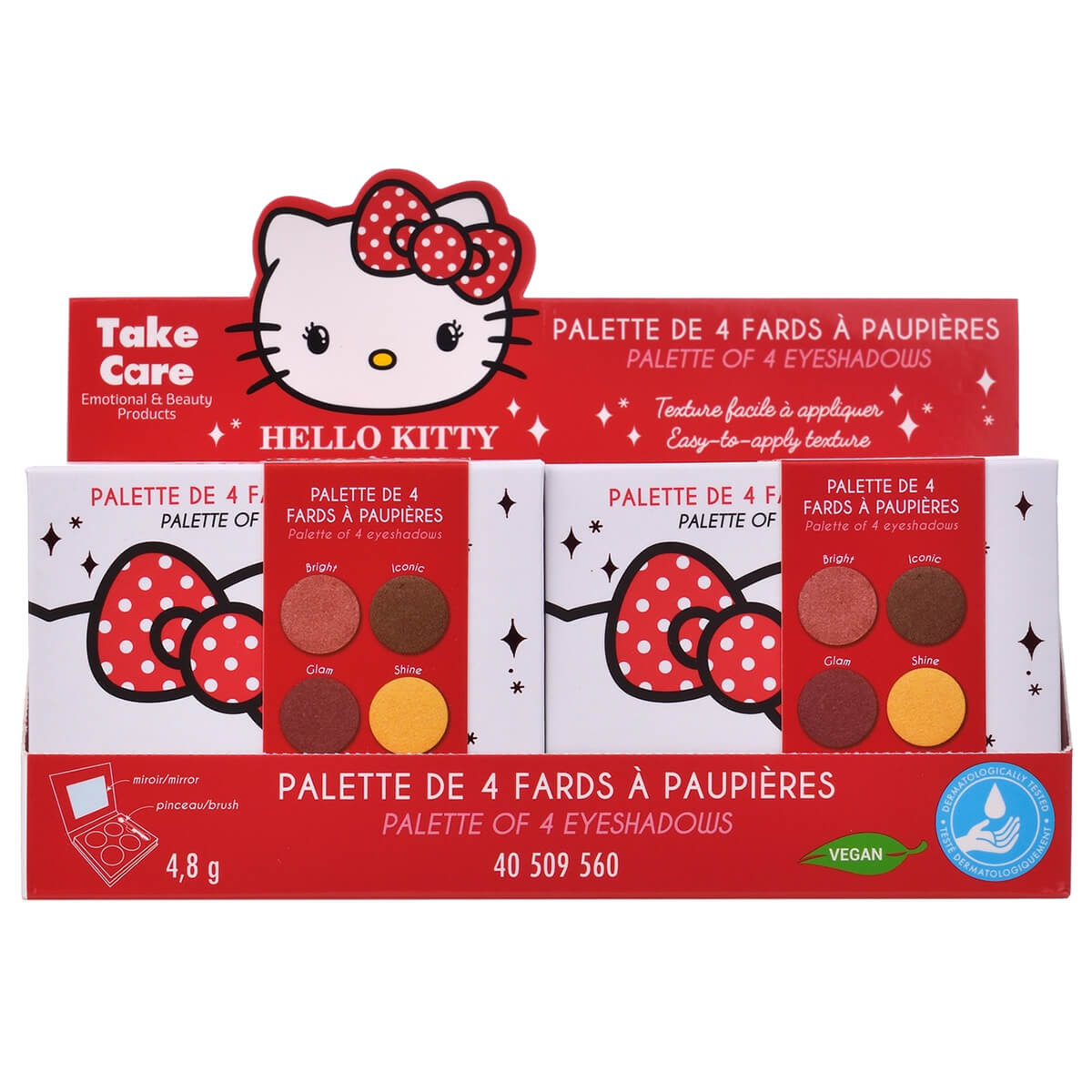 Hello Kitty Eyeshadow Palette by Take Care. The Hello Kitty eyeshadow palette allows you to create a multitude of looks, from the softest and natural to the most daring and glamorous. Unleash your creativity and express yourself in style. Contains four flattering and easy to apply eye shades: Bright, Iconic, Glam and Shine. The eyeshadows are formulated with high quality ingredients for intense pigmentation and long-lasting wear. You can be sure that your makeup will stay beautiful all day long. The palette includes a brush to apply the shadows and a mirror.