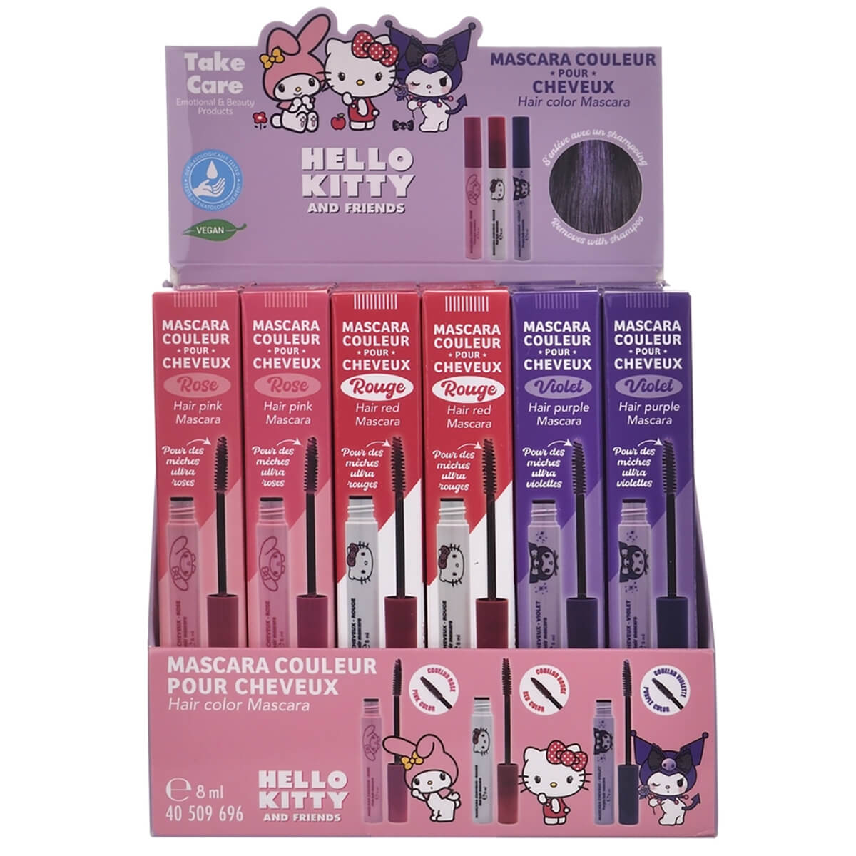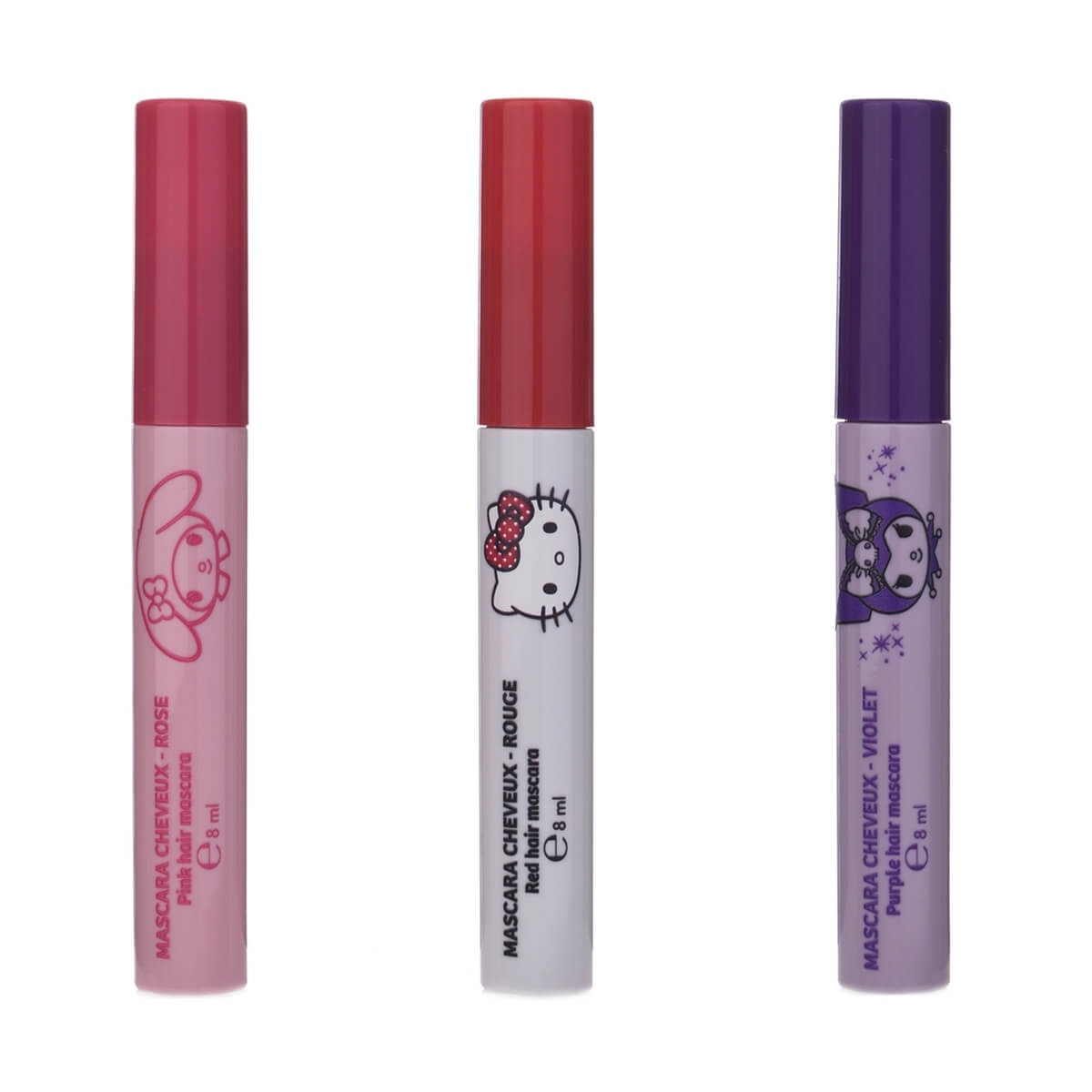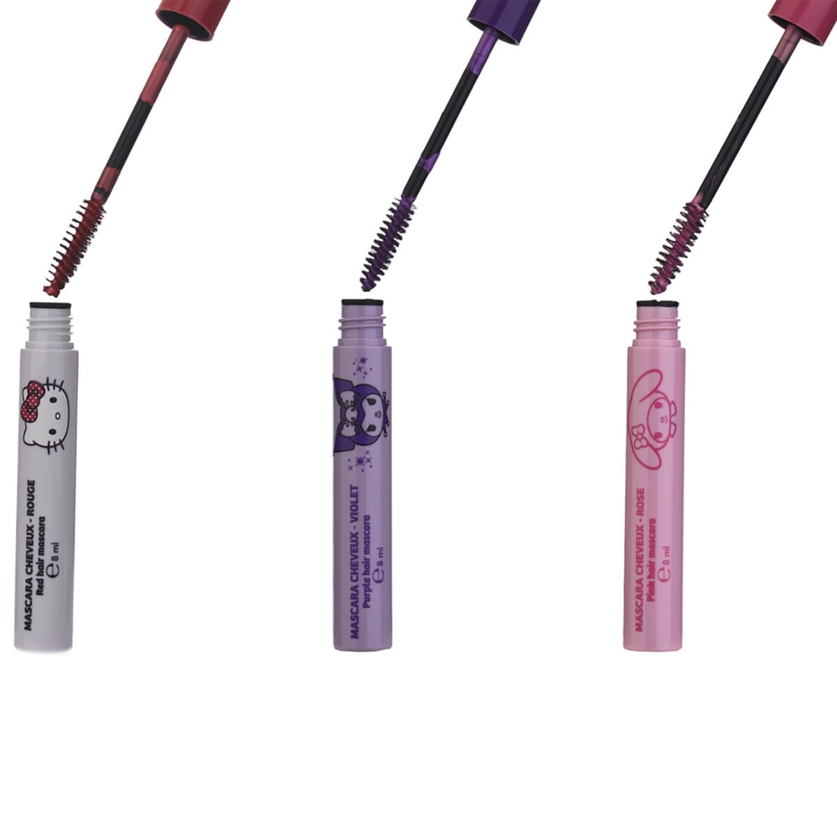 Hello Kitty & Friends hair mascara by Take Care. Add bright and ephemeral colour to hair with these hair mascaras inspired by Hello Kitty and her friends. Available in three fun temporary wash-out colours - Hello Kitty (red), My Melody (pink) and Kuromi (purple). Easy to apply and mess-free with a mascara style brush applicator, the vegan formula respects hair and the environment, perfect for a touch of fun colour for parties and dress up.