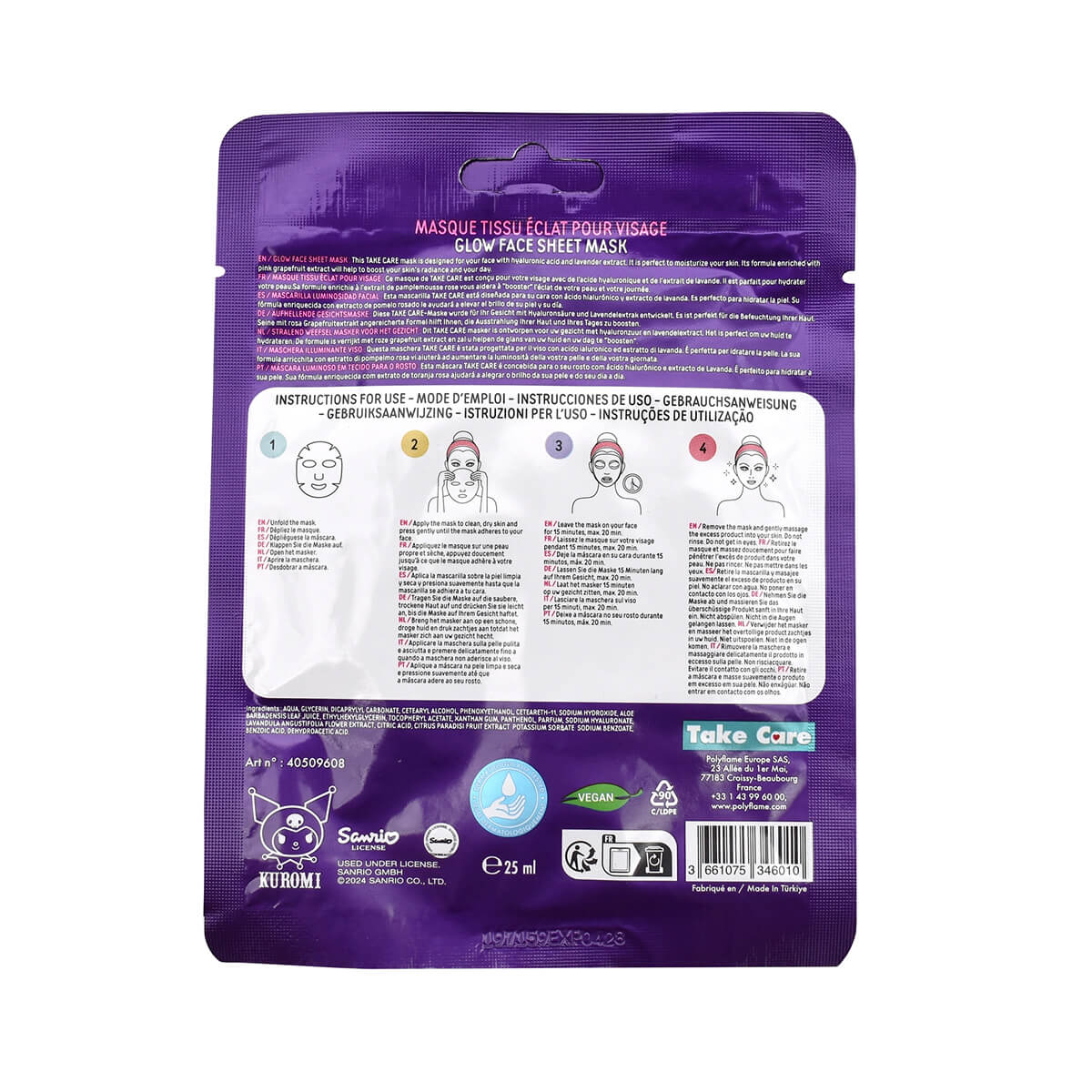 Kuromi Glow Face Tissue Mask by Take Care. To relax, nothing beats a face mask. And when this mask plunges you back into the dark world of Kuromi, it's even better! Share a real moment of relaxation with your children for hydrated and detoxified skin with a rebalancing effect.