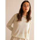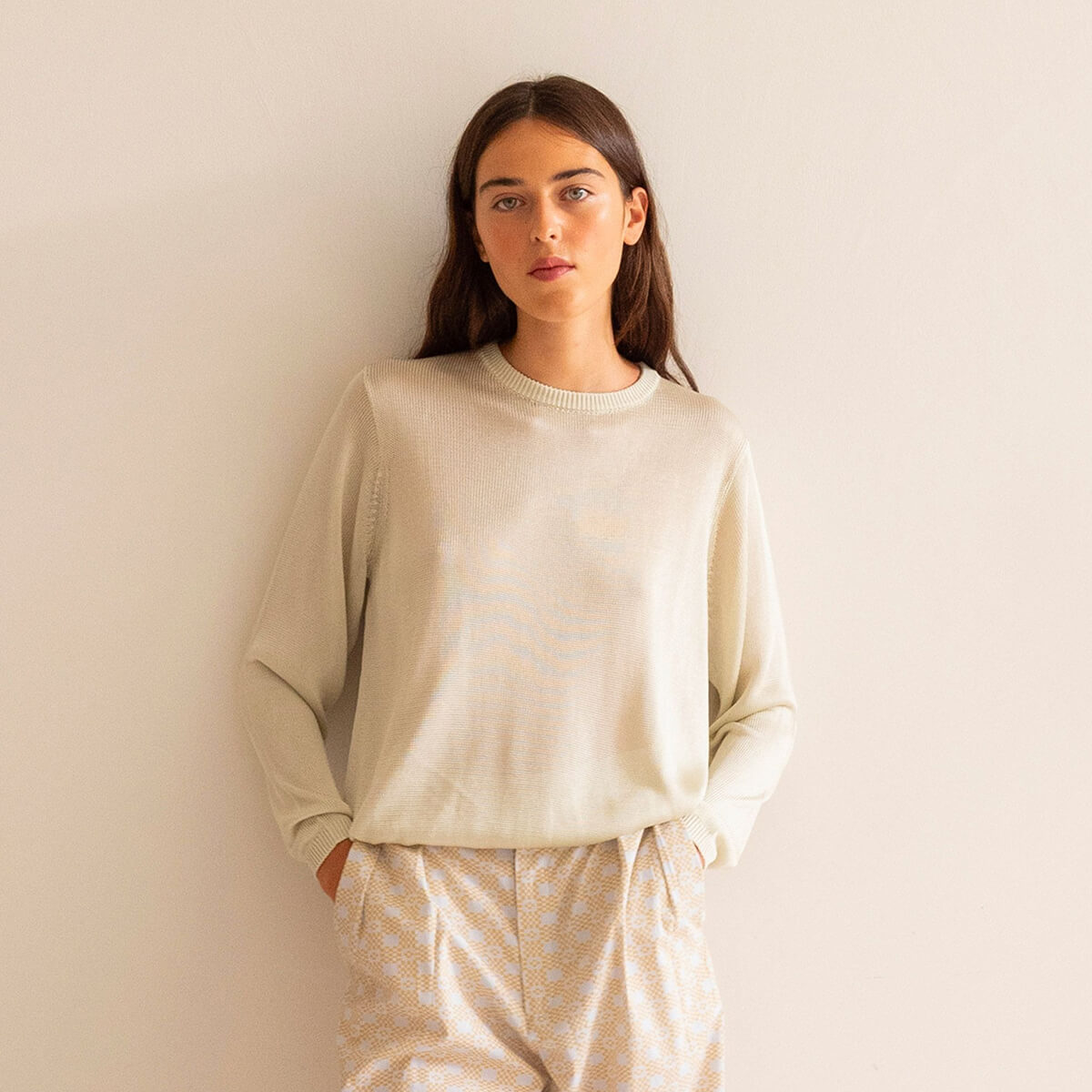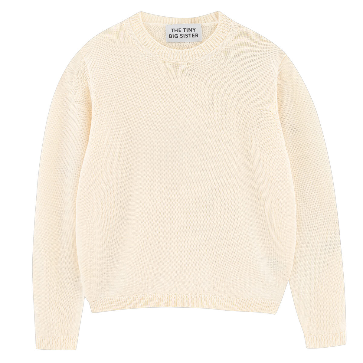 Chloe Shiny Sweater by The Tiny Big Sister. Introducing the Chloe shiny sweater in off white. Crafted with silk-like viscose, this sweater offers a perfect blend of comfort and style. Its shiny finish adds a touch of sophistication to any outfit.