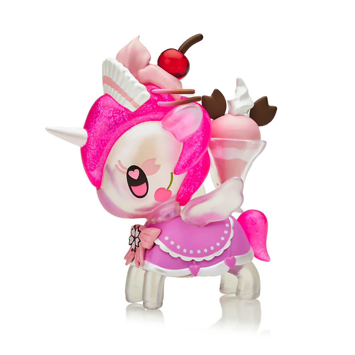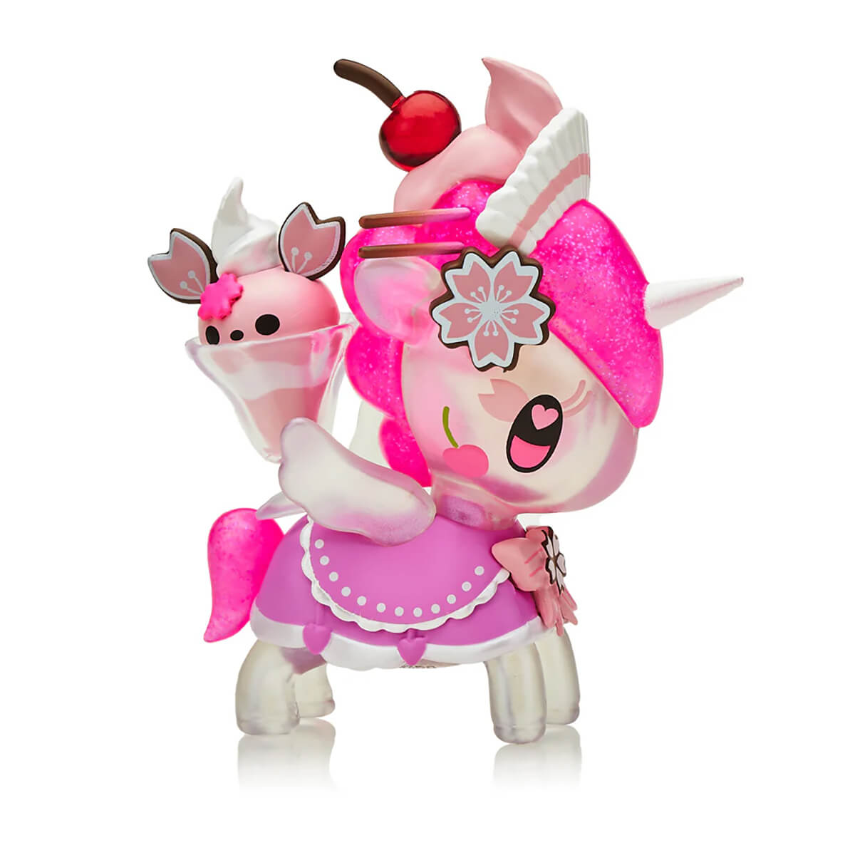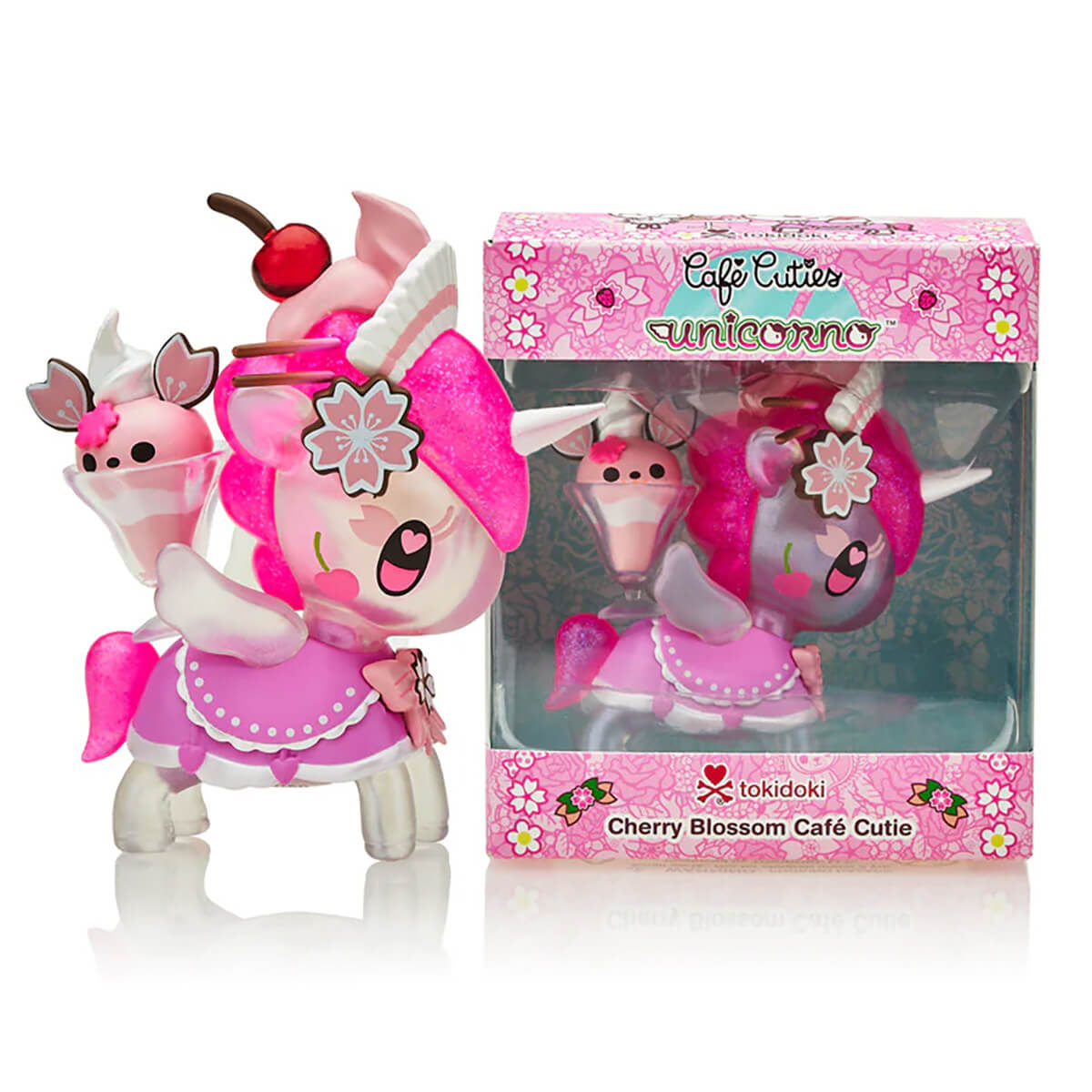 Café Unicorno Series 5 Cherry Blossom Special Edition by Tokidoki. Cherry Blossom Cafe Cuties Unicorno's favorite treat is a Cherry Blossom Sundae! She loves visiting her favorite cafe to order this yummy dessert and to hang out with friends or to relax alone. Enjoy the sweetness of a beautiful spring day with Cherry Blossom Cafe Cuties Unicorno, in neon and pastel colours with a frosted semi-transparent body, injected glitter details and a transparent sundae glass.