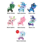Each figure is sealed in a silver foil bag. Characters include: Mystic Spellina, Mystic Moonella, Mystic Luna, Mystic Candela, Mystic Lukky, Mystic Quartzy and Mystic Andromeda (chaser!). Features may include iridescent and transparent detail, glitter injection, and more.