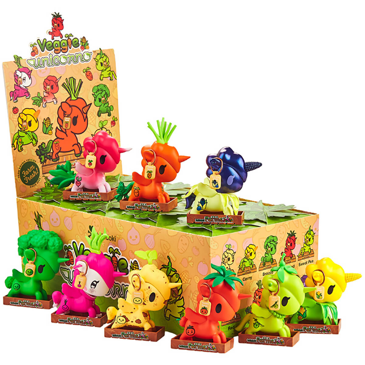 Veggie Unicorno Blind Box by Tokidoki. Every Spring the Veggie Unicorno begin to poke their heads up from the soil and sprout luscious leaves so they can bring delicious, nutritious food to the world. The Veggie Unicorno Series features Unicorno that represent nature's gift of healthy foods like broccoli, peas, tomatoes, and carrots. Each Veggie Unicorno comes with a separate Tokidoki Farms crate and seed tag. Enjoy a vitamin boost of fun with Veggie Unicorno Blind Box!