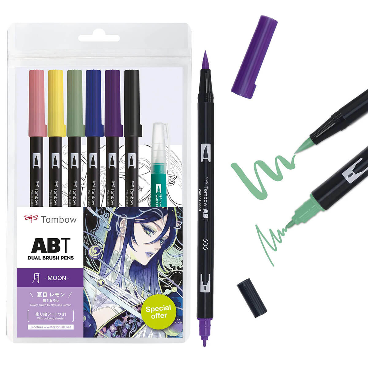 Tombow ABT Dual Brush Pens by Tombow. Set of 6 waterbased double ended brush pens. ABT Dual Brush Pens have two tips: a flexible soft brush-shaped tip for fine, medium, and bold strokes, and a fine tip for more precise lines, borders, graphics, and stencils. Water based pens can be mixed layered with water to create a watercolour painting effect. The set contains 6 Manga moon themed colours plus one colourlesss blender.