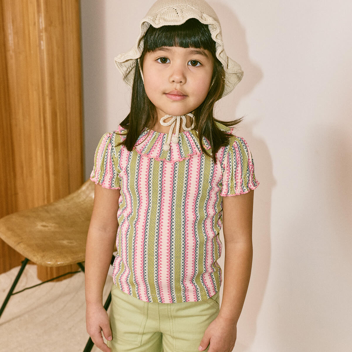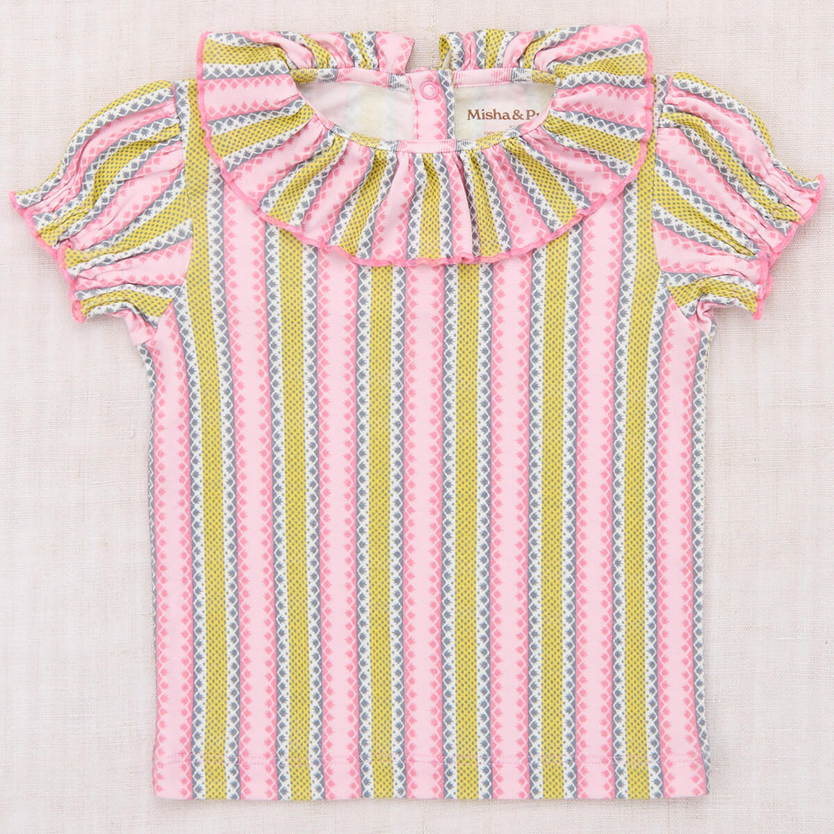 Balloon Sleeve Paloma Tee by Misha & Puff. A short-sleeved slim-fit tee in soft organic Pima cotton, featuring a gathered ruffle neck with a merrowed edge and snap closure at the back neck.