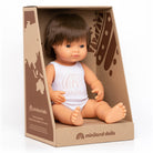 Caucasian boy doll with brown hair by Miniland. Anatomically correct doll dressed in underwear and lightly vanilla scented to smell like a newborn baby. With moveable limbs and head and sewn on hair, the doll is manufactured from non-toxic Phthalates-free vinyl, which makes it soft and flexible to touch, and very resilient. The doll can also be bathed. Comes in an eco-friendly cardboard box.