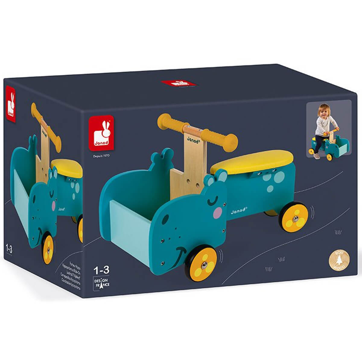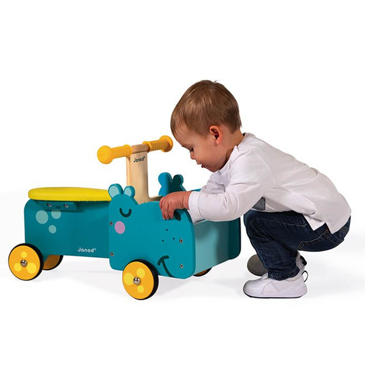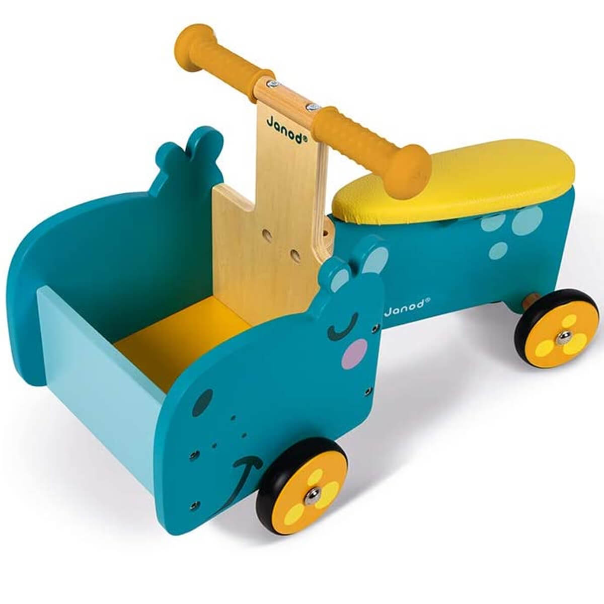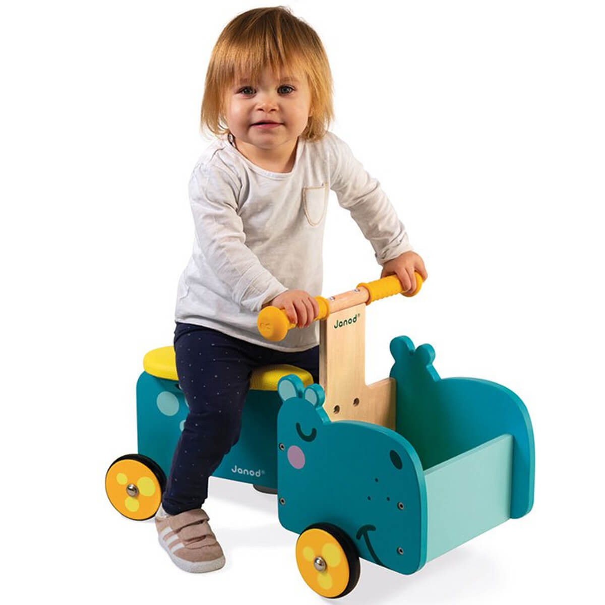 Hippopotamus ride on by Janod.  This lovely hippopotamus-shaped ride-on toy is ideal for the development of your child’s motor skills and sense of balance.  It will become the ideal companion, helping children to better manage their stance while enabling them to explore the world around them.  Children can use the little front compartment to bring along their toys and cuddle toys wherever they go. The ergonomic handles ensure optimal grip for children’s little hands.  Finally, with its 4 silent rubber wheels, this ride-on toy will leave no marks on the floor and safely ensure good grip.