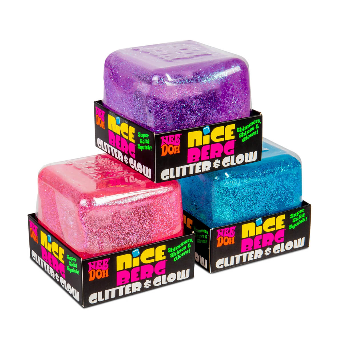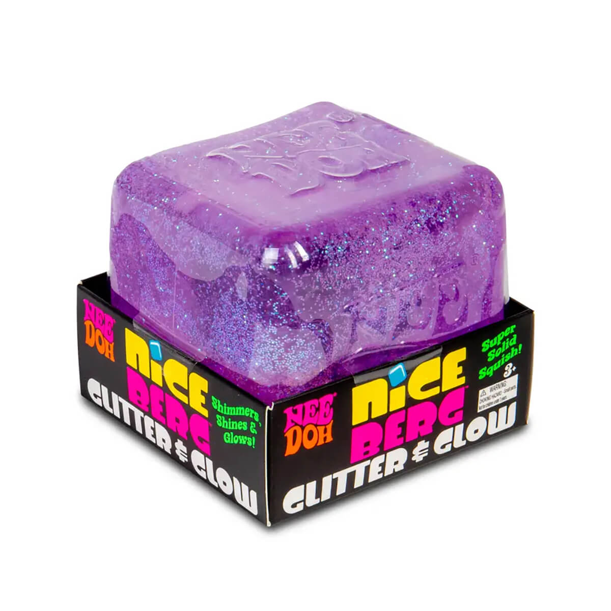 Niceberg Needoh Glitter & Glow squishy toy by Schylling. Super size your shimmer and shine with the Nice Berg Glitter & Glow! This enormous Squishy toy provides a two-handed super solid squish that is twice as satisfying. This Needoh is getting a sparkly upgrade with glitter inside to add extra radiance to your day! This Giant fidget toy isn't just for the daylight; it also Glows in the Dark to highlight your night with a magical neon beam.