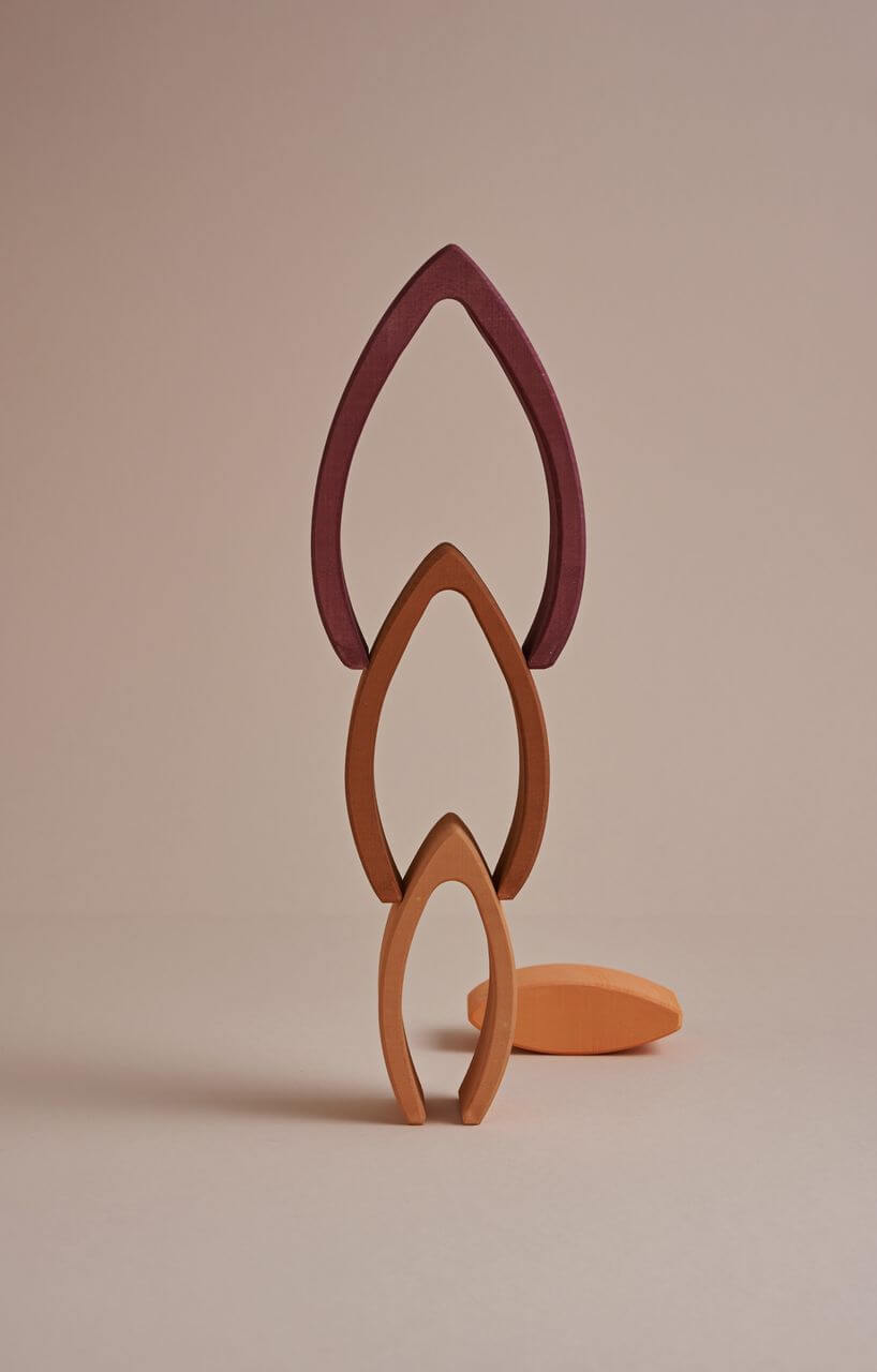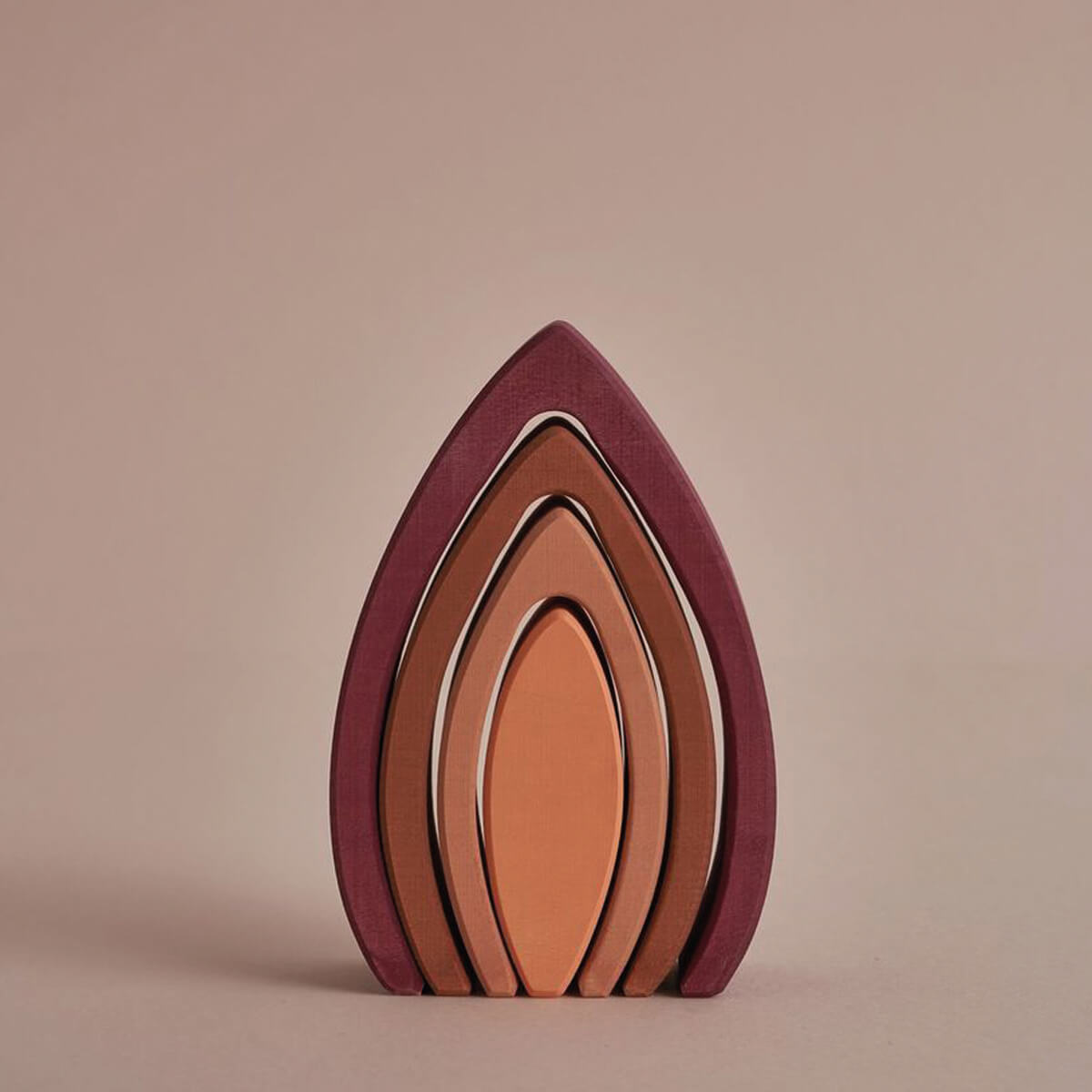 Flame arch stacker by Raduga Grëz.  4 piece stacking flame arch made from solid lime wood and dyed with non-toxic watercolours.  Great for creative and imaginative play and with endless possibilities.  Comes with a cotton drawstring bag for storage.