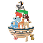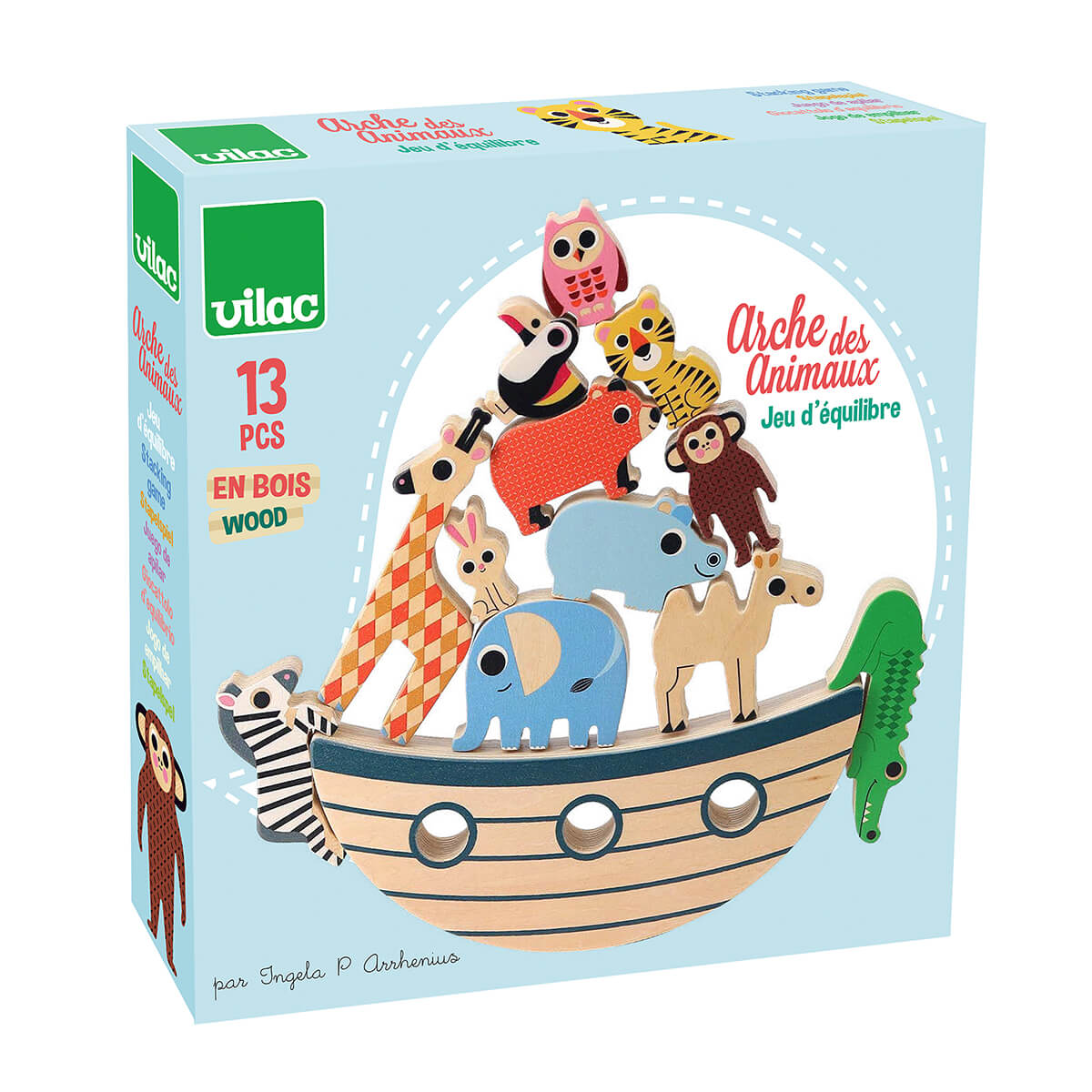 Animal Ark Stacking Game by Vilac. Let your little one explore this carefully constructed balance game with the beautiful animal designs on all the wooden pieces. The balancing aspect of this wooden game stimulates children to try different methods of stacking the pieces onto the ark.