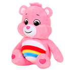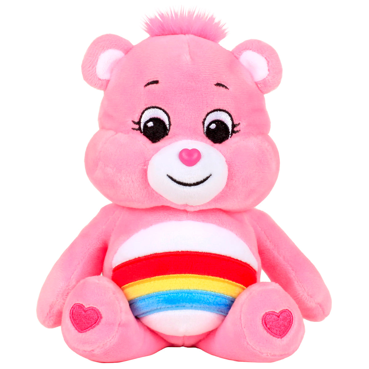 Care Bears Cheer Bear plush soft teddy bear by Hasbro. 9" plush Care Bear with a beany bottom to help them sit. Cheer Bear has a smiling face and an appliqué rainbow on their tummy.