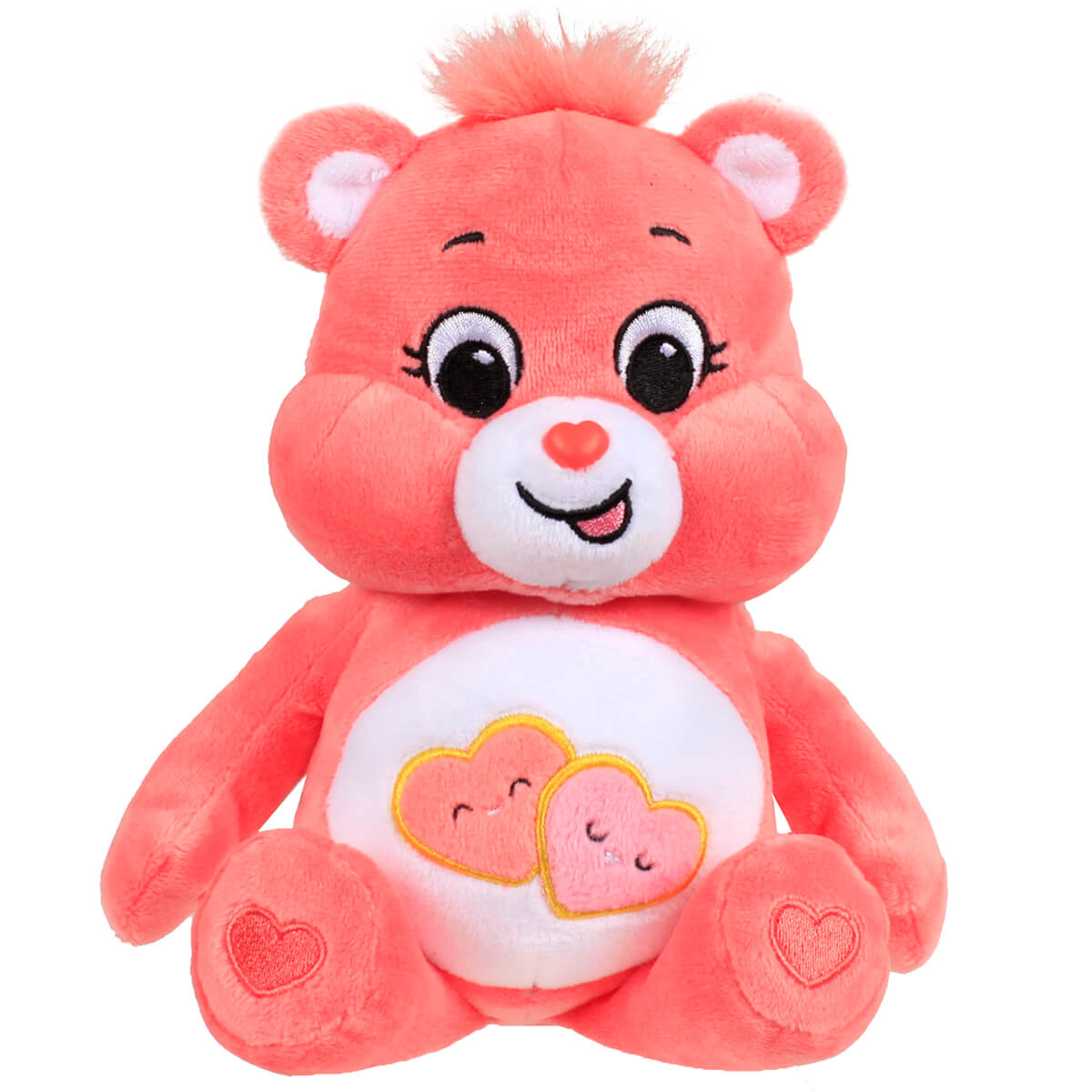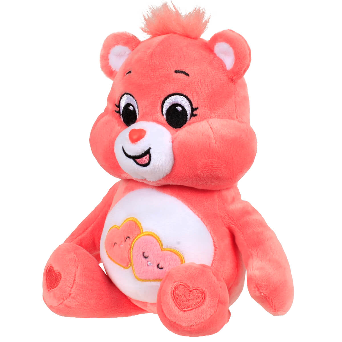 Care Bears Love-a-Lot Bear plush soft teddy bear by Hasbro. 9" plush Care Bear with a beany bottom to help them sit. Love-a-Lot Bear is has a kind face and has an appliqué love hearts on their tummy.