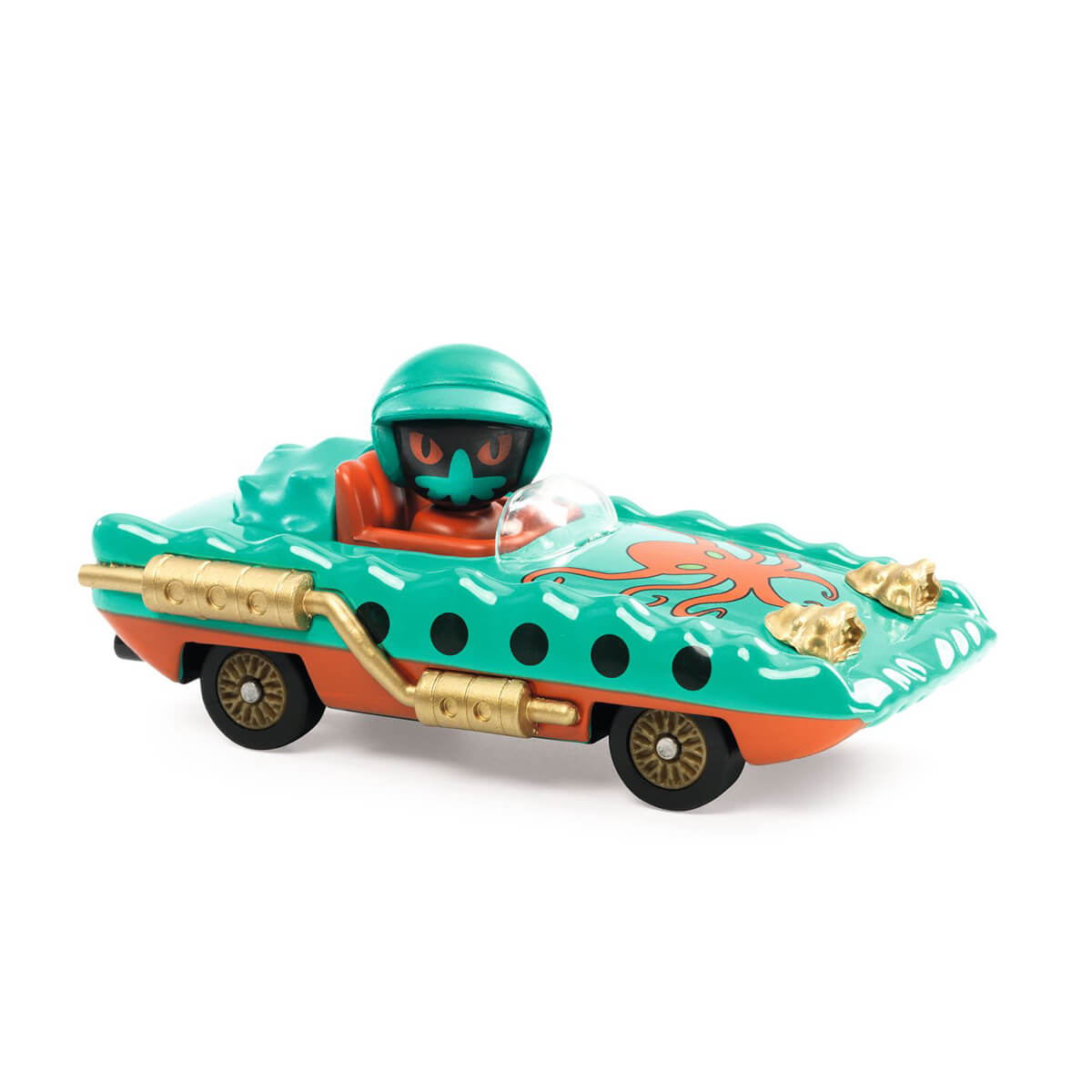 Crazy Motors Abys Engine Car by Djeco. Metal racing car with realistic suspension and character racer. This Crazy Motor is inspired by the ocean's depths. Abys Engine is nicely decorated with an octopus on its hood, is it because it is fast and smart? Equipped with headlights and a super-powerful engine, it dives into the heart of the oceans to discover what is hidden in the depths.